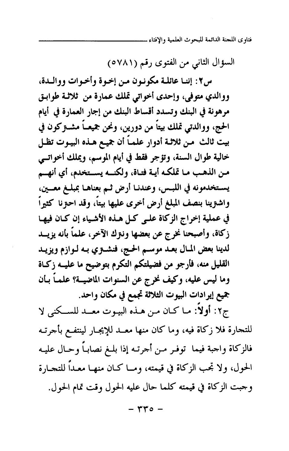 س2: إننا عائلة مكونون من إخوة وأخوات ووالدة، ووالدي متوفى، وإحدى أخواتي تملك عمارة من ثلاثة طوابق مرهونة في البنك وتسدد أقساط البنك من إيجار العمارة في أيام الحج، ووالدتي تملك بيتا من دورين، ونحن جميعا مشتركون في بيت ثالث من ثلاثة أدوار علما أن جميع هذه البيوت تظل خالية طوال السنة، وتؤجر فقط في أيام الموسم، ويملك أخواتي من الذهب ما تملكه أية فتاة، ولكنه يستخدم، أي أنهم يستخدمونه في اللبس، وعندنا أرض ثم بعناها بمبلغ معين، واشترينا بنصف المبلغ أرضا أخرى عليها بيتا، وقد احترنا كثيرا في عملية إخراج الزكاة على كل هذه الأشياء إن كان فيها زكاة، وأصبحنا نخرج عن بعضها ونترك الآخر، علما بأنه يزيد لدينا بعض المال بعد موسم الحج، فنشتري به لوازم ويزيد القليل منه، فأرجو من فضيلتكم التكرم بتوضيح ما عليه زكاة وما ليس عليه، وكيف نخرج عن السنوات الماضية؟ علما بأن جميع إيرادات البيوت الثلاثة تجمع في مكان واحد.