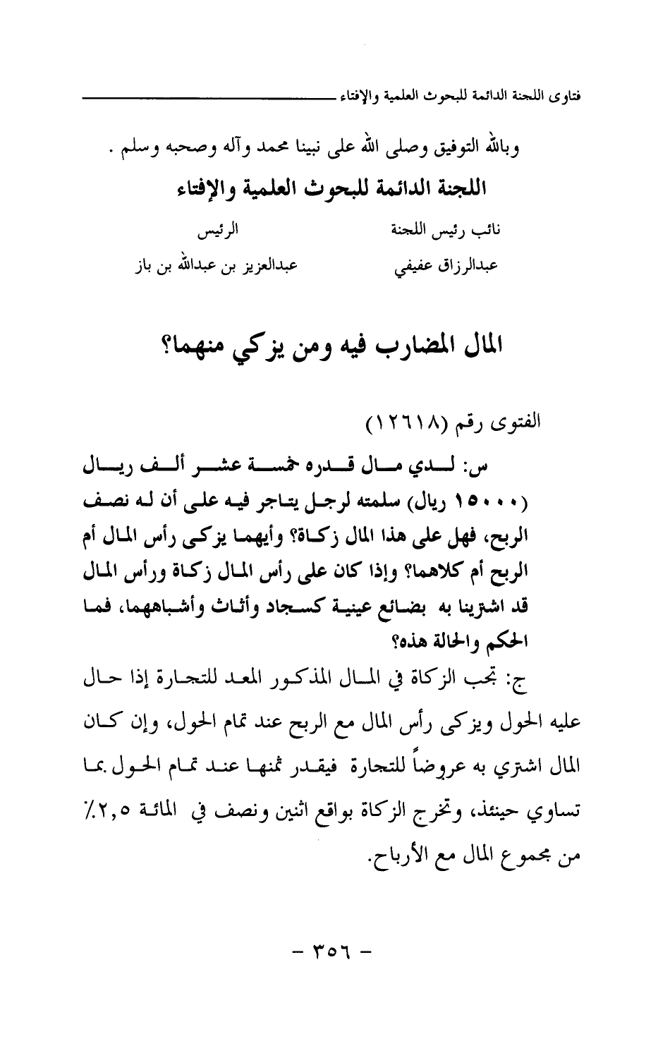 س: لدي مال قدره خمسة عشر ألف ريال (15000 ريال) سلمته لرجل يتاجر فيه على أن له نصف الربح، فهل على هذا المال زكاة؟ وأيهما يزكى رأس المال أم الربح أم كلاهما؟ وإذا كان على رأس المال زكاة ورأس المال قد اشترينا به بضائع عينية كسجاد وأثاث وأشباههما، فما الحكم والحالة هذه؟
