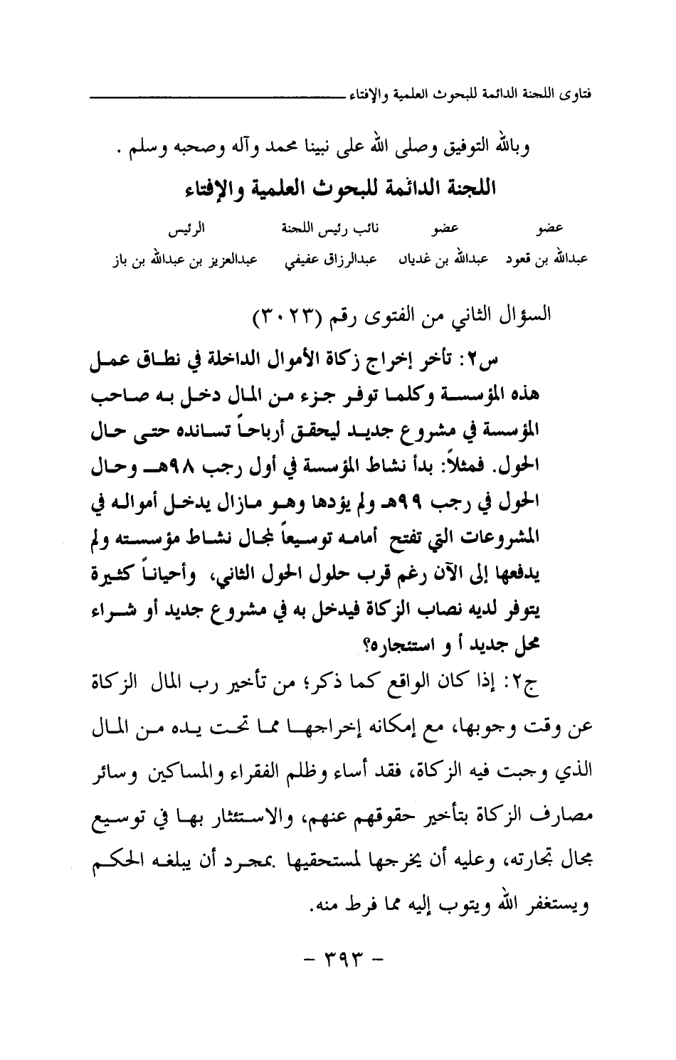 س2: تأخر إخراج زكاة الأموال الداخلة في نطاق عمل هذه المؤسسة وكلما توفر جزء من المال دخل به صاحب المؤسسة في مشروع جديد ليحقق أرباحا تسانده حتى حال الحول. فمثلا: بدأ نشاط المؤسسة في أول رجب 98هـ وحال الحول في رجب 99هـ ولم يؤدها وهو ما زال يدخل أمواله في المشروعات التي تفتح أمامه توسيعا لمجال نشاط مؤسسته ولم يدفعها إلى الآن رغم قرب حلول الحول الثاني، وأحيانا كثيرة يتوفر لديه نصاب الزكاة فيدخل به في مشروع جديد أو شراء محل جديد أو استئجاره؟