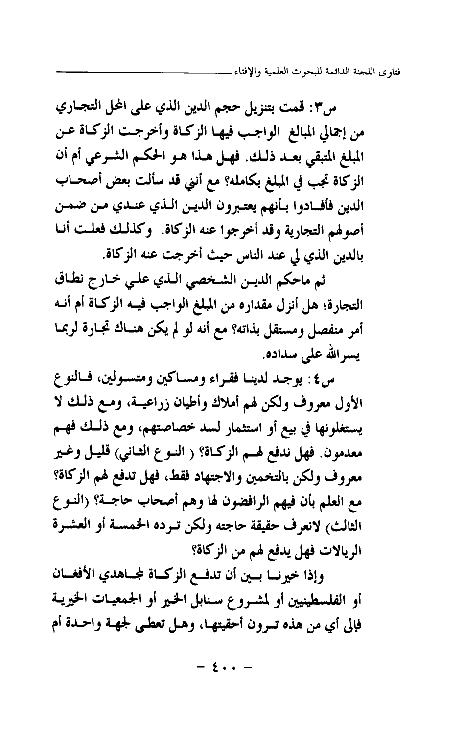 س3: قمت بتنزيل حجم الدين الذي على المحل التجاري من إجمالي المبالغ الواجب فيها الزكاة وأخرجت الزكاة عن المبلغ المتبقي بعد ذلك. فهل هذا هو الحكم الشرعي أم أن الزكاة تجب في المبلغ بكامله؟ مع أنني قد سألت بعض أصحاب الدين فأفادوا بأنهم يعتبرون الدين الذي عندي من ضمن أصولهم التجارية وقد أخرجوا عنه الزكاة. وكذلك فعلت أنا بالدين الذي لي عند الناس حيث أخرجت عنه الزكاة.
