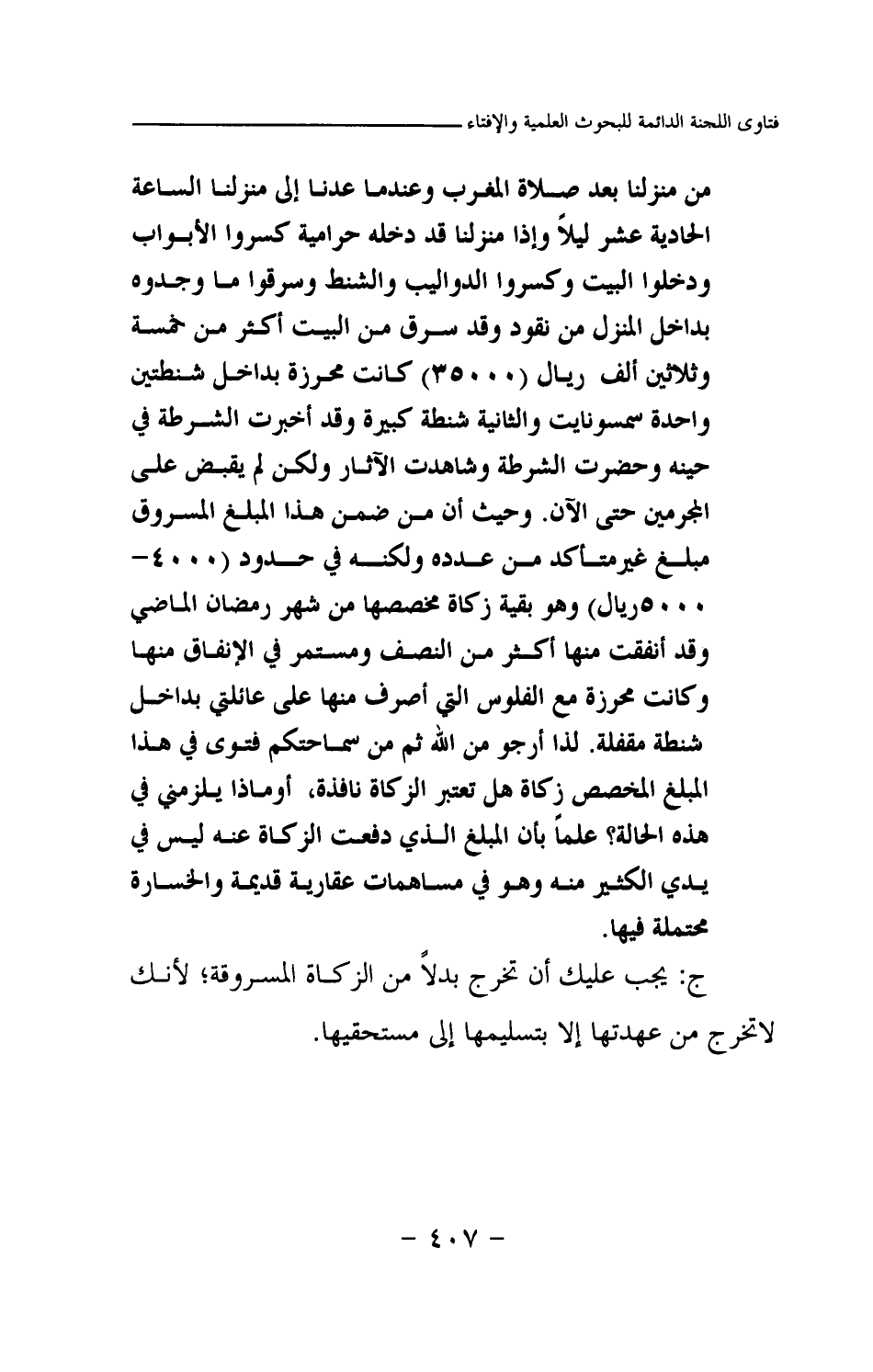 من منزلنا بعد صلاة المغرب وعندما عدنا إلى منزلنا الساعة الحادية عشر ليلا وإذا منزلنا قد دخله حرامية كسروا الأبواب ودخلوا البيت وكسروا الدواليب والشنط وسرقوا ما وجدوه بداخل المنزل من نقود وقد سرق من البيت أكثر من خمسة وثلاثين ألف ريال (35000) كانت محرزة بداخل شنطتين واحدة سمسونايت والثانية شنطة كبيرة وقد أخبرت الشرطة في حينه وحضرت الشرطة وشاهدت الآثار ولكن لم يقبض على المجرمين حتى الآن. وحيث إن من ضمن هذا المبلغ المسروق مبلغ غير متأكد من عدده ولكنه في حدود (4000-5000 ريال) وهو بقية زكاة مخصصها من شهر رمضان الماضي وقد أنفقت منها أكثر من النصف ومستمر في الإنفاق منها وكانت محرزة مع الفلوس التي أصرف منها على عائلتي بداخل شنطة مقفلة. لذا أرجو من الله ثم من سماحتكم فتوى في هذا المبلغ المخصص زكاة هل تعتبر الزكاة نافذة، أو ماذا يلزمني في هذه الحالة؟ علما بأن المبلغ الذي دفعت الزكاة عنه ليس في يدي الكثير منه وهو في مساهمات عقارية قديمة والخسارة محتملة فيها.