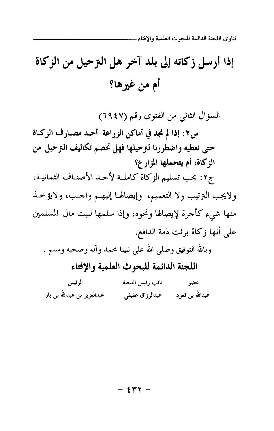 ج2: يجب تسليم الزكاة كاملة لأحد الأصناف الثمانية، ولا يجب الترتيب ولا التعميم، وإيصالها إليهم واجب، ولا يؤخذ منها شيء كأجرة لإيصالها ونحوه، وإذا سلمها لبيت مال المسلمين على أنها زكاة برئت ذمة الدافع.