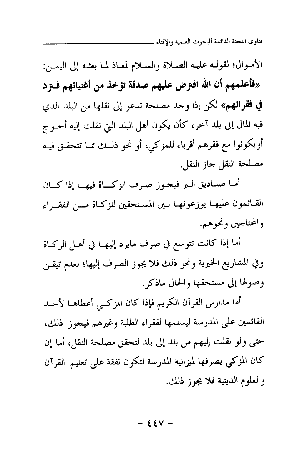 الأموال؛ لقوله عليه الصلاة والسلام لمعاذ لما بعثه إلى اليمن: «فأعلمهم أن الله افترض عليهم صدقة تؤخذ من أغنيائهم فترد في فقرائهم (¬1) » لكن إذا وجد مصلحة تدعو إلى نقلها من البلد الذي فيه المال إلى بلد آخر، كأن يكون أهل البلد التي نقلت إليه أحوج أو يكونوا مع فقرهم أقرباء للمزكي، أو نحو ذلك مما تتحقق فيه مصلحة النقل جاز النقل.