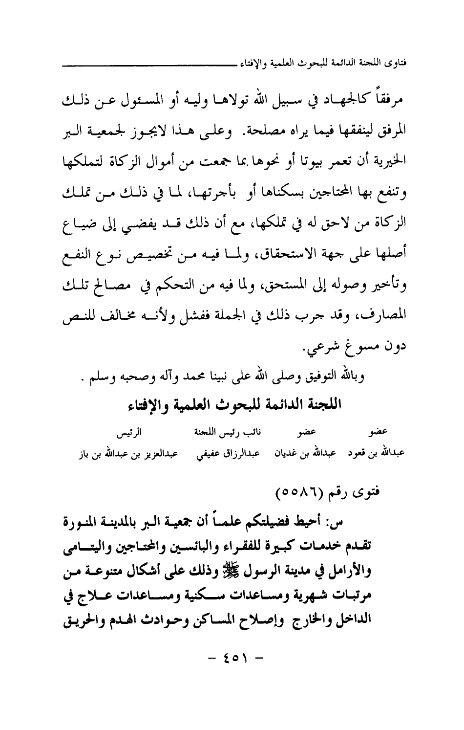 مرفقا كالجهاد في سبيل الله تولاها وليه أو المسئول عن ذلك المرفق لينفقها فيما يراه مصلحة. وعلى هذا لا يجوز لجمعية البر الخيرية أن تعمر بيوتا أو نحوها بما جمعت من أموال الزكاة لتملكها وتنفع بها المحتاجين بسكناها أو بأجرتها، لما في ذلك من تملك الزكاة من لا حق له في تملكها، مع أن ذلك قد يفضي إلى ضياع أصلها على جهة الاستحقاق، ولما فيه من تخصيص نوع النفع وتأخير وصوله إلى المستحق، ولما فيه من التحكم في مصالح تلك المصارف، وقد جرب ذلك في الجملة ففشل ولأنه مخالف للنص دون مسوغ شرعي.