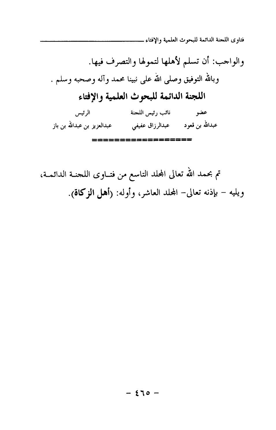 تم بحمد الله تعالى المجلد التاسع من فتاوى اللجنة الدائمة ويليه - بإذنه تعالى- المجلد العاشر وأوله: (أهل الزكاة) .