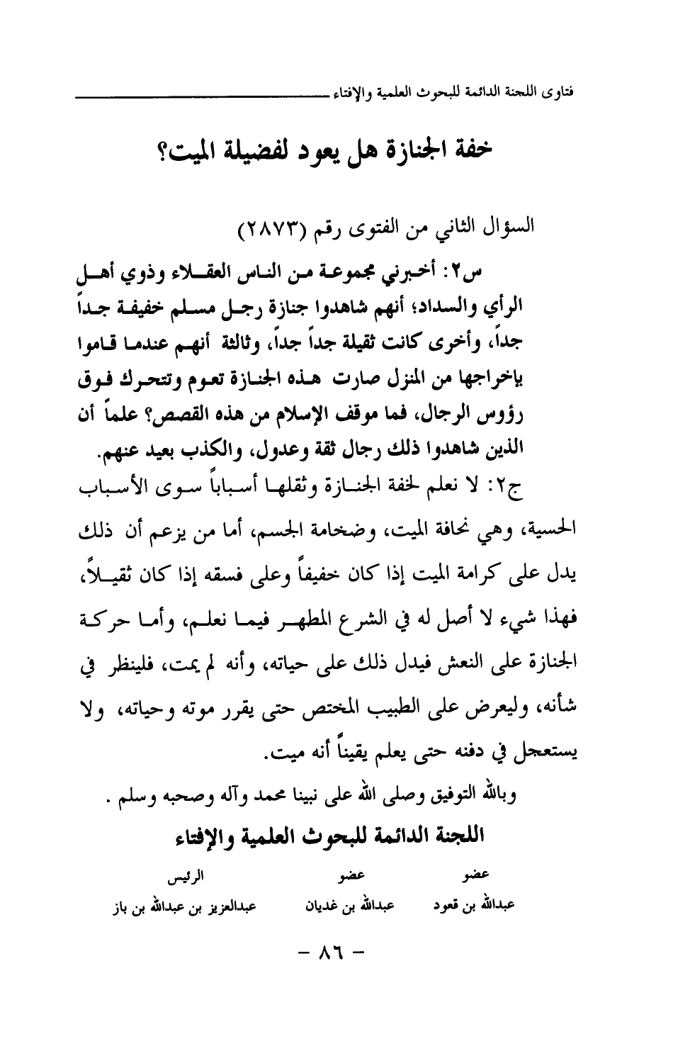 ج2: لا نعلم لخفة الجنازة وثقلها أسبابا سوى الأسباب الحسية، وهي نحافة الميت، وضخامة الجسم، أما من يزعم أن ذلك يدل على كرامة الميت إذا كان خفيفا وعلى فسقه إذا كان ثقيلا، فهذا شيء لا أصل له في الشرع المطهر فيما نعلم، وأما حركة الجنازة على النعش فيدل ذلك على حياته، وأنه لم يمت، فلينظر في شأنه، وليعرض على الطبيب المختص حتى يقرر موته وحياته، ولا يستعجل في دفنه حتى يعلم يقينا أنه ميت.
