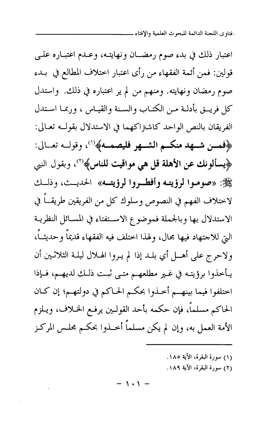 اعتبار ذلك في بدء صوم رمضان ونهايته، وعدم اعتباره على قولين: فمن أئمة الفقهاء من رأى اعتبار اختلاف المطالع في بدء صوم رمضان ونهايته. ومنهم من لم ير اعتباره في ذلك. واستدل كل فريق بأدلة من الكتاب والسنة والقياس، وربما استدل الفريقان بالنص الواحد كاشتراكهما في الاستدلال بقوله تعالى: {فَمَنْ شَهِدَ مِنْكُمُ الشَّهْرَ فَلْيَصُمْهُ} (¬1) وقوله تعالى: {يَسْأَلُونَكَ عَنِ الْأَهِلَّةِ قُلْ هِيَ مَوَاقِيتُ لِلنَّاسِ} (¬2) وبقول النبي صلى الله عليه وسلم: «صوموا لرؤيته وأفطروا لرؤيته (¬3) » الحديث، وذلك لاختلاف الفهم في النصوص وسلوك كل من الفريقين طريقا في الاستدلال بها وبالجملة فموضوع الاستفتاء في المسائل النظرية التي للاجتهاد فيها مجال، ولهذا اختلف فيه الفقهاء قديما وحديثا، ولا حرج على أهل أي بلد إذا لم يروا الهلال ليلة الثلاثين أن يأخذوا برؤيته في غير مطلعهم متى ثبت ذلك لديهم، فإذا اختلفوا فيما بينهم أخذوا بحكم الحاكم في دولتهم؛ إن كان الحاكم مسلما، فإن حكمه بأحد القولين يرفع الخلاف، ويلزم الأمة العمل به، وإن لم يكن مسلما أخذوا بحكم مجلس المركز