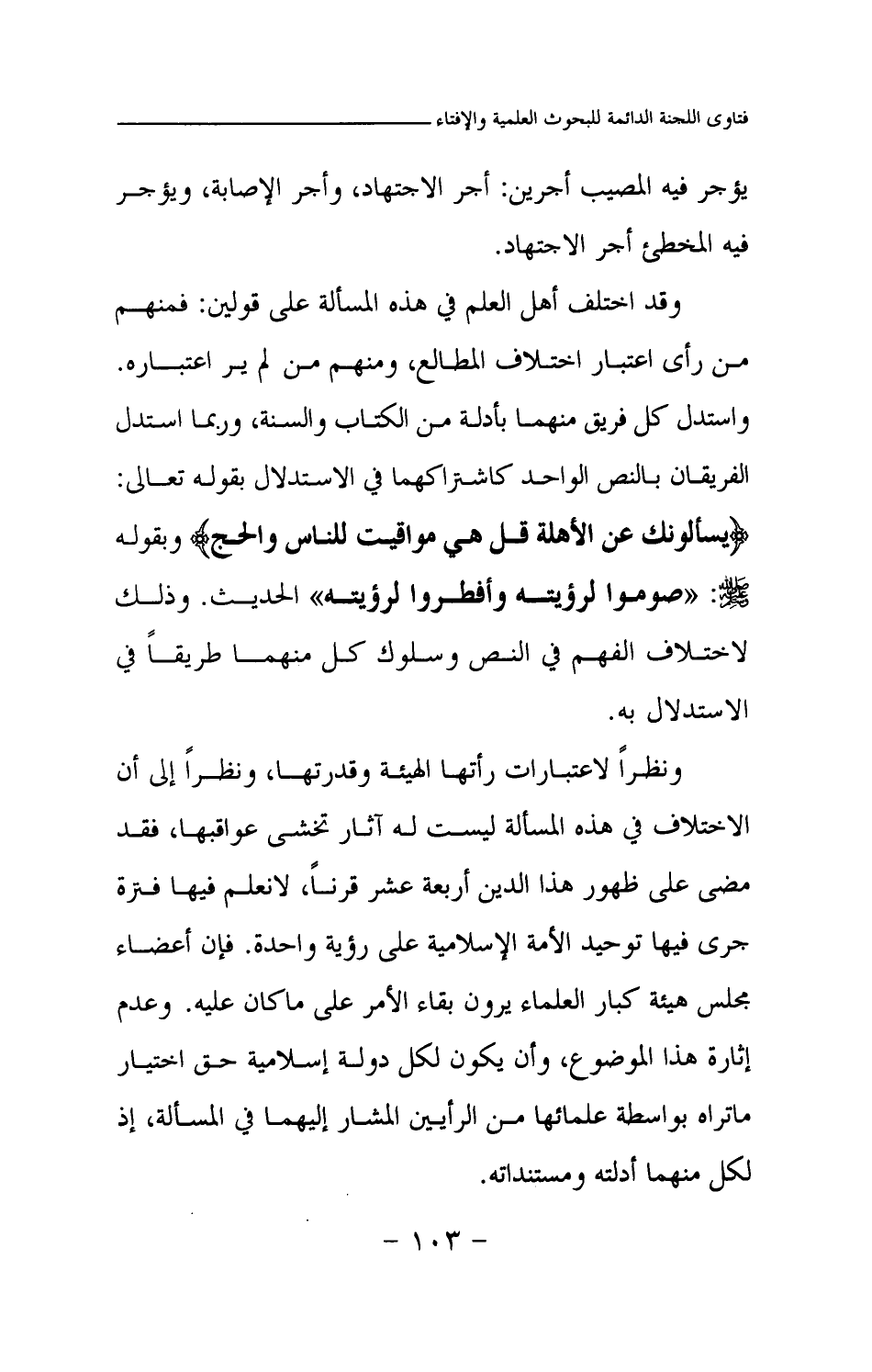 يؤجر فيه المصيب أجرين: أجر الاجتهاد، وأجر الإصابة، ويؤجر فيه المخطئ أجر الاجتهاد. وقد اختلف أهل العلم في هذه المسألة على قولين: فمنهم من رأى اعتبار اختلاف المطالع، ومنهم من لم ير اعتباره. واستدل كل فريق منهما بأدلة من الكتاب والسنة، وربما استدل الفريقان بالنص الواحد كاشتراكهما في الاستدلال بقوله تعالى: {يَسْأَلُونَكَ عَنِ الْأَهِلَّةِ قُلْ هِيَ مَوَاقِيتُ لِلنَّاسِ وَالْحَجِّ} (¬1) وبقوله صلى الله عليه وسلم: «صوموا لرؤيته وأفطروا لرؤيته (¬2) » الحديث. وذلك لاختلاف الفهم في النص وسلوك كل منهما طريقا في الاستدلال به. ونظرا لاعتبارات رأتها الهيئة وقدرتها، ونظرا إلى أن الاختلاف في هذه المسألة ليست له آثار تخشى عواقبها، فقد مضى على ظهور هذا الدين أربعة عشر قرنا، لا نعلم فيها فترة جرى فيها توحيد الأمة الإسلامية على رؤية واحدة. فإن أعضاء مجلس هيئة كبار العلماء يرون بقاء الأمر على ما كان عليه. وعدم إثارة هذا الموضوع، وأن يكون لكل دولة إسلامية حق اختيار ما تراه بواسطة علمائها من الرأيين المشار إليهما في المسألة، إذ لكل منهما أدلته ومستنداته.