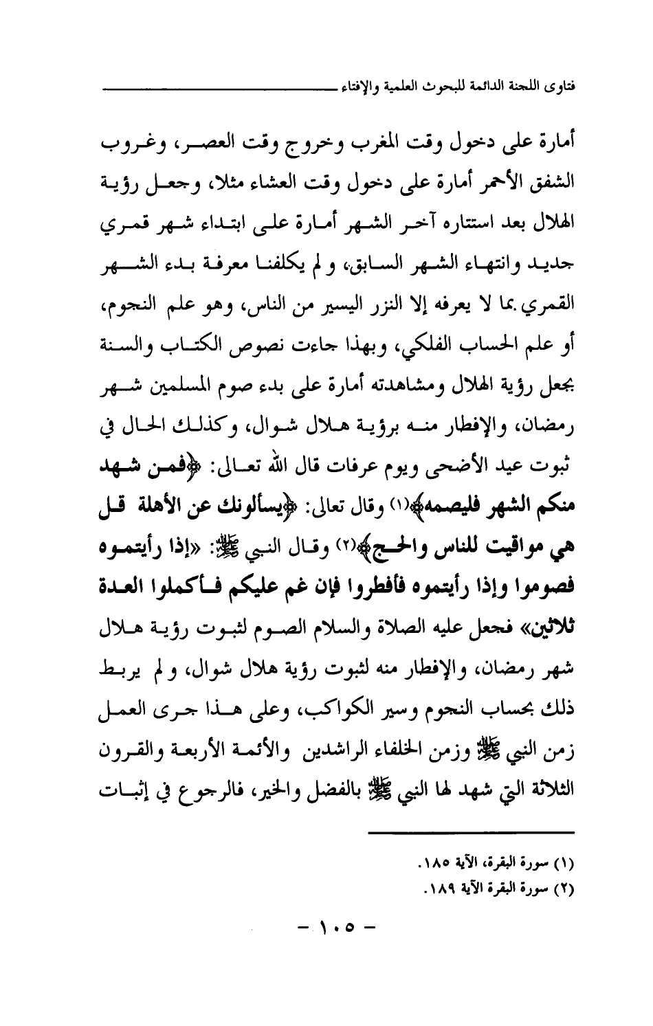 الظهر وغروب الشمس على دخول وقت المغرب وخروج وقت العصر، وغروب الشفق الأحمر أمارة على دخول وقت العشاء مثلا، وجعل رؤية الهلال بعد استتاره آخر الشهر أمارة على ابتداء شهر قمري جديد وانتهاء الشهر السابق، ولم يكلفنا معرفة بدء الشهر القمري بما لا يعرفه إلا النزر اليسير من الناس، وهو علم النجوم، أو علم الحساب الفلكي، وبهذا جاءت نصوص الكتاب والسنة بجعل رؤية الهلال ومشاهدته أمارة على بدء صوم المسلمين شهر رمضان، والإفطار منه برؤية هلال شوال، وكذلك الحال في ثبوت عيد الأضحى ويوم عرفات قال الله تعالى: {فَمَنْ شَهِدَ مِنْكُمُ الشَّهْرَ فَلْيَصُمْهُ} (¬1) وقال تعالى: {يَسْأَلُونَكَ عَنِ الْأَهِلَّةِ قُلْ هِيَ مَوَاقِيتُ لِلنَّاسِ وَالْحَجِّ} (¬2) وقال النبي صلى الله عليه وسلم: «إذا رأيتموه فصوموا وإذا رأيتموه فأفطروا فإن غم عليكم فأكملوا العدة ثلاثين (¬3) » فجعل عليه الصلاة والسلام الصوم لثبوت رؤية هلال شهر رمضان، والإفطار منه لثبوت رؤية هلال شوال، ولم يربط ذلك بحساب النجوم وسير الكواكب، وعلى هذا جرى العمل زمن النبي صلى الله عليه وسلم وزمن الخلفاء الراشدين والأئمة الأربعة والقرون الثلاثة التي شهد لها النبي صلى الله عليه وسلم بالفضل والخير، فالرجوع في إثبات