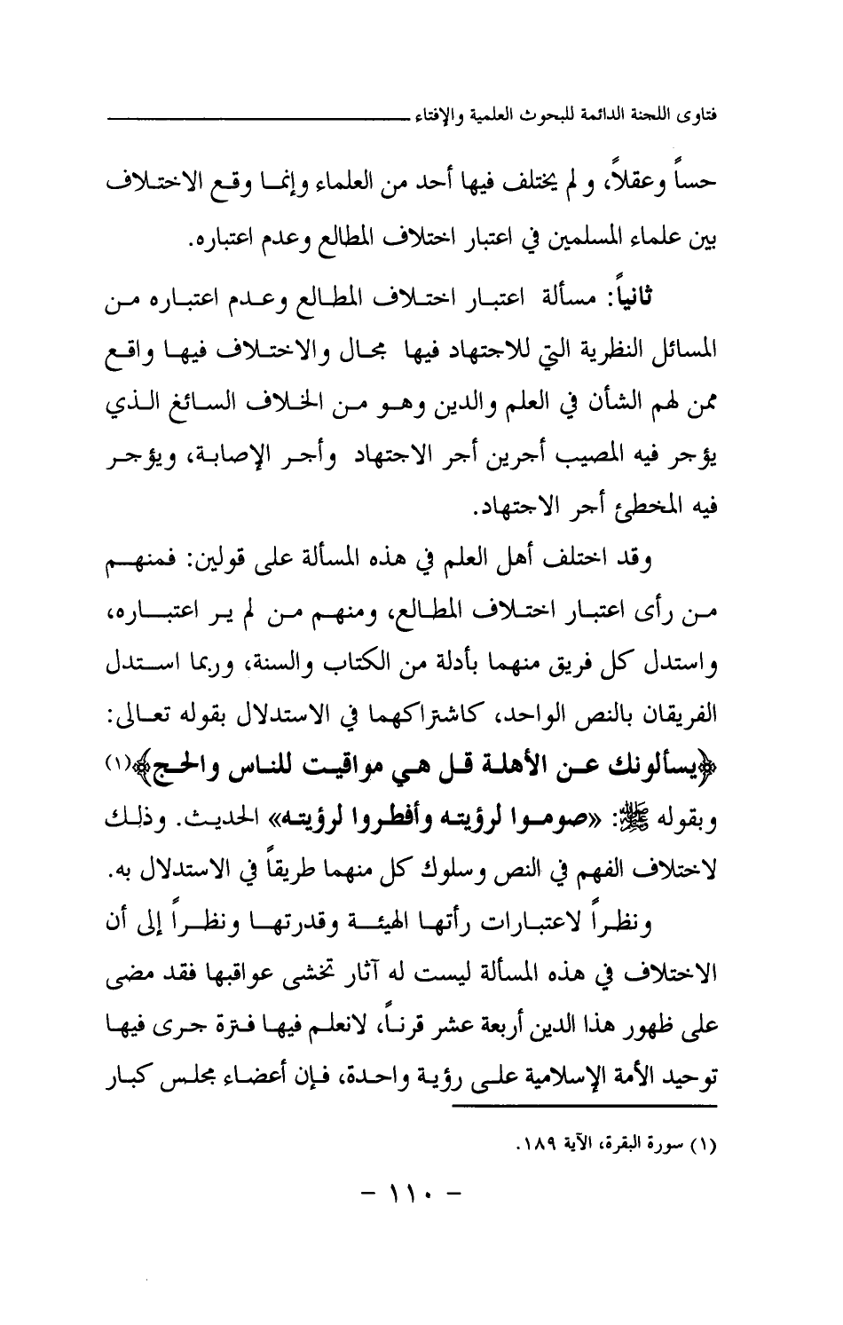 حسا وعقلا، ولم يختلف فيها أحد من العلماء وإنما وقع الاختلاف بين علماء المسلمين في اعتبار اختلاف المطالع وعدم اعتباره. ثانيا: مسألة اعتبار اختلاف المطالع وعدم اعتباره من المسائل النظرية التي للاجتهاد فيها مجال والاختلاف فيها واقع ممن لهم الشأن في العلم والدين وهو من الخلاف السائغ الذي يؤجر فيه المصيب أجرين أجر الاجتهاد وأجر الإصابة، ويؤجر فيه المخطئ أجر الاجتهاد. وقد اختلف أهل العلم في هذه المسألة على قولين: فمنهم من رأى اعتبار اختلاف المطالع، ومنهم من لم ير اعتباره، واستدل كل فريق منهما بأدلة من الكتاب والسنة، وربما استدل الفريقان بالنص الواحد، كاشتراكهما في الاستدلال بقوله تعالى: {يَسْأَلُونَكَ عَنِ الْأَهِلَّةِ قُلْ هِيَ مَوَاقِيتُ لِلنَّاسِ وَالْحَجِّ} (¬1) وبقوله صلى الله عليه وسلم: «صوموا لرؤيته وأفطروا لرؤيته (¬2) » الحديث. وذلك لاختلاف الفهم في النص وسلوك كل منهما طريقا في الاستدلال به. ونظرا لاعتبارات رأتها الهيئة وقدرتها ونظرا إلى أن الاختلاف في هذه المسألة ليست له آثار تخشى عواقبها فقد مضى على ظهور هذا الدين أربعة عشر قرنا، لا نعلم فيها فترة جرى فيها توحيد الأمة الإسلامية على رؤية واحدة، فإن أعضاء مجلس كبار