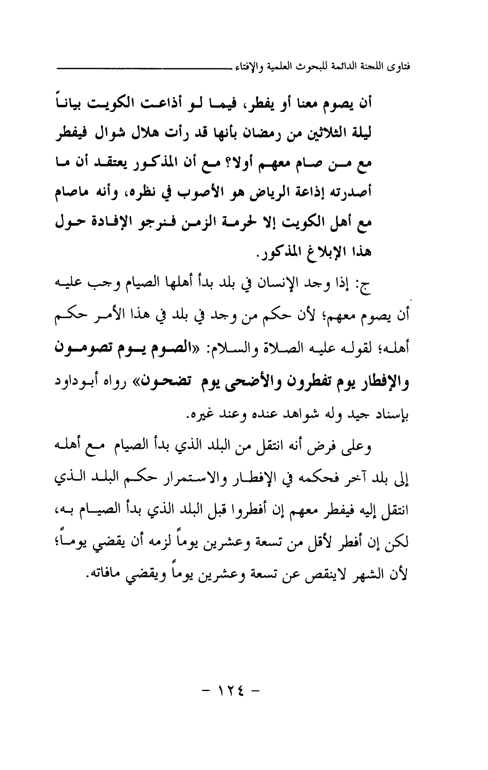 أن يصوم معنا أو يفطر، فيما لو أذاعت الكويت بيانا ليلة الثلاثين من رمضان بأنها قد رأت هلال شوال فيفطر مع من صام معهم أولا؟ مع أن المذكور يعتقد أن ما أصدرته إذاعة الرياض هو الأصوب في نظره، وأنه ما صام مع أهل الكويت إلا لحرمة الزمن فنرجو الإفادة حول هذا الإبلاغ المذكور.