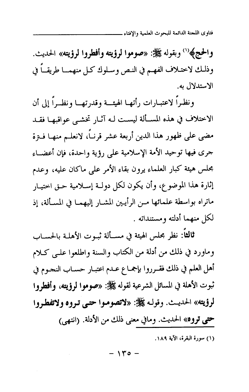 وبقوله صلى الله عليه وسلم: «صوموا لرؤيته وأفطروا لرؤيته (¬1) » الحديث. وذلك لاختلاف الفهم في النص وسلوك كل منهما طريقا في الاستدلال به. ونظرا لاعتبارات رأتها الهيئة وقدرتها ونظرا إلى أن الاختلاف في هذه المسألة ليست له آثار تخشى عواقبها فقد مضى على ظهور هذا الدين أربعة عشر قرنا، لا نعلم منها فترة جرى فيها توحيد الأمة الإسلامية على رؤية واحدة، فإن أعضاء مجلس هيئة كبار العلماء يرون بقاء الأمر على ما كان عليه، وعدم إثارة هذا الموضوع، وأن يكون لكل دولة إسلامية حق اختيار ما تراه بواسطة علمائها من الرأيين المشار إليهما في المسألة، إذ لكل منهما أدلته ومستنداته.