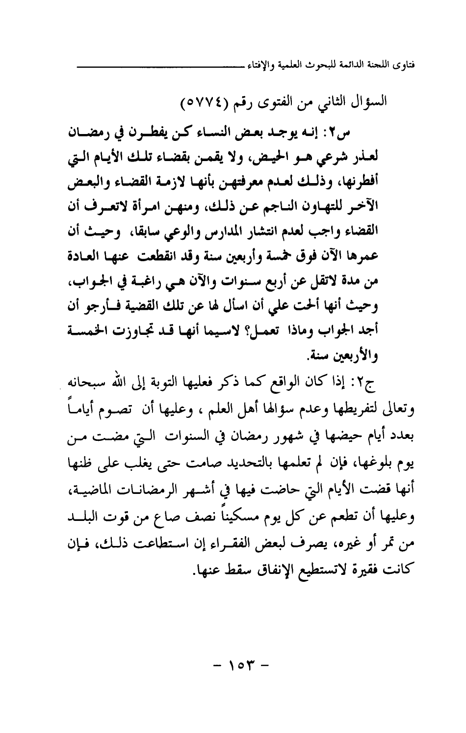 س2: إنه يوجد بعض النساء كن يفطرن في رمضان لعذر شرعي هو الحيض، ولا يقمن بقضاء تلك الأيام التي أفطرنها، وذلك لعدم معرفتهن بأنها لازمة القضاء والبعض الآخر للتهاون الناجم عن ذلك، ومنهن امرأة لا تعرف أن القضاء واجب لعدم انتشار المدارس والوعي سابقا، وحيث إن عمرها الآن فوق خمسة وأربعين سنة وقد انقطعت عنها العادة من مدة لا تقل عن أربع سنوات والآن هي راغبة في الجواب، وحيث إنها ألحت علي أن أسأل لها عن تلك القضية فأرجو أن أجد الجواب وماذا تعمل؟ لا سيما أنها قد تجاوزت الخمسة والأربعين سنة.