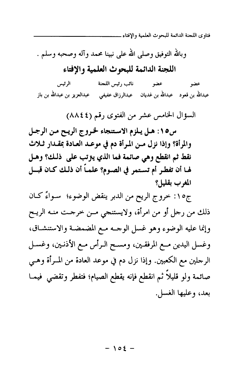 س15: هل يلزم الاستنجاء لخروج الريح من الرجل والمرأة؟ وإذا نزل من المرأة دم في موعد العادة بمقدار ثلاث نقط ثم انقطع وهي صائمة فما الذي يترتب على ذلك؟ وهل لها أن تفطر أم تستمر في الصوم؟ علما أن ذلك كان قبل المغرب بقليل؟