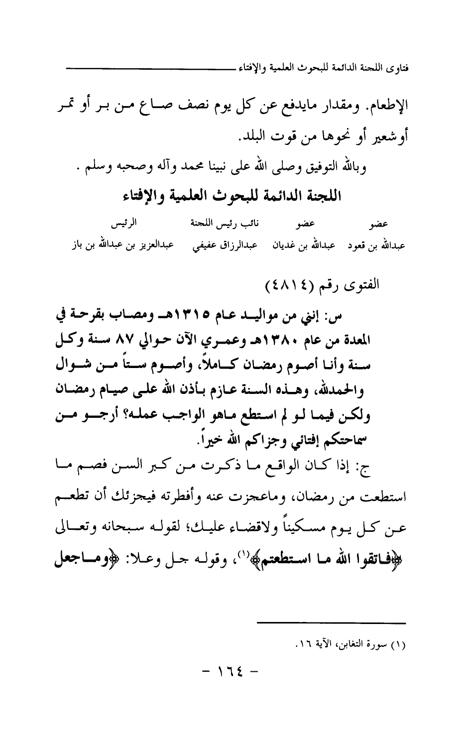 ج: إذا كان الواقع ما ذكرت من كبر السن فصم ما استطعت من رمضان، وما عجزت عنه وأفطرته فيجزئك أن تطعم عن كل يوم مسكينا ولا قضاء عليك؛ لقوله سبحانه وتعالى {فَاتَّقُوا اللَّهَ مَا اسْتَطَعْتُمْ} (¬1) وقوله جل وعلا: {وَمَا جَعَلَ عَلَيْكُمْ فِي الدِّينِ مِنْ حَرَجٍ} (¬2)