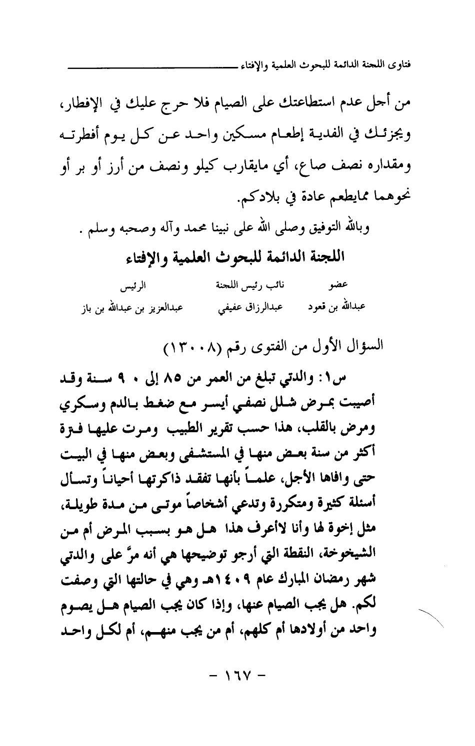 س1: والدتي تبلغ من العمر من 85 إلى 90 سنة وقد أصيبت بمرض شلل نصفي أيسر مع ضغط بالدم وسكري ومرض بالقلب، هذا حسب تقرير الطبيب ومرت عليها فترة أكثر من سنة بعض منها في المستشفى وبعض منها في البيت حتى وافاها الأجل، علما بأنها تفقد ذاكرتها أحيانا وتسأل أسئلة كثيرة ومتكررة وتدعي أشخاصا موتى من مدة طويلة، مثل إخوة لها وأنا لا أعرف هذا هل هو بسبب المرض أم من الشيخوخة، النقطة التي أرجو توضيحها هي أنه مر على والدتي شهر رمضان المبارك عام 1409هـ وهي في حالتها التي وصفت لكم.