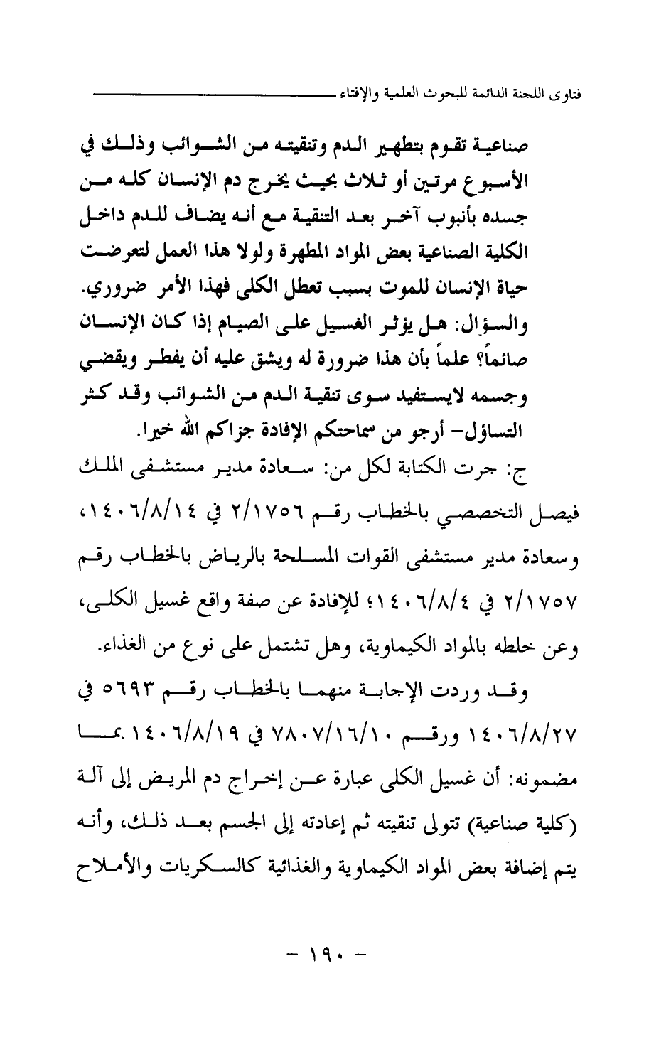 وقد وردت الإجابة منهما بالخطاب رقم 5693 في 27 \ 8 \ 1406 ورقم 10 \ 16 \ 7807 في 19 \ 8 \ 1406 بما مضمونه: أن غسيل الكلى عبارة عن إخراج دم المريض إلى آلة (كلية صناعية) تتولى تنقيته ثم إعادته إلى الجسم بعد ذلك، وأنه يتم إضافة بعض المواد الكيماوية والغذائية كالسكريات والأملاح