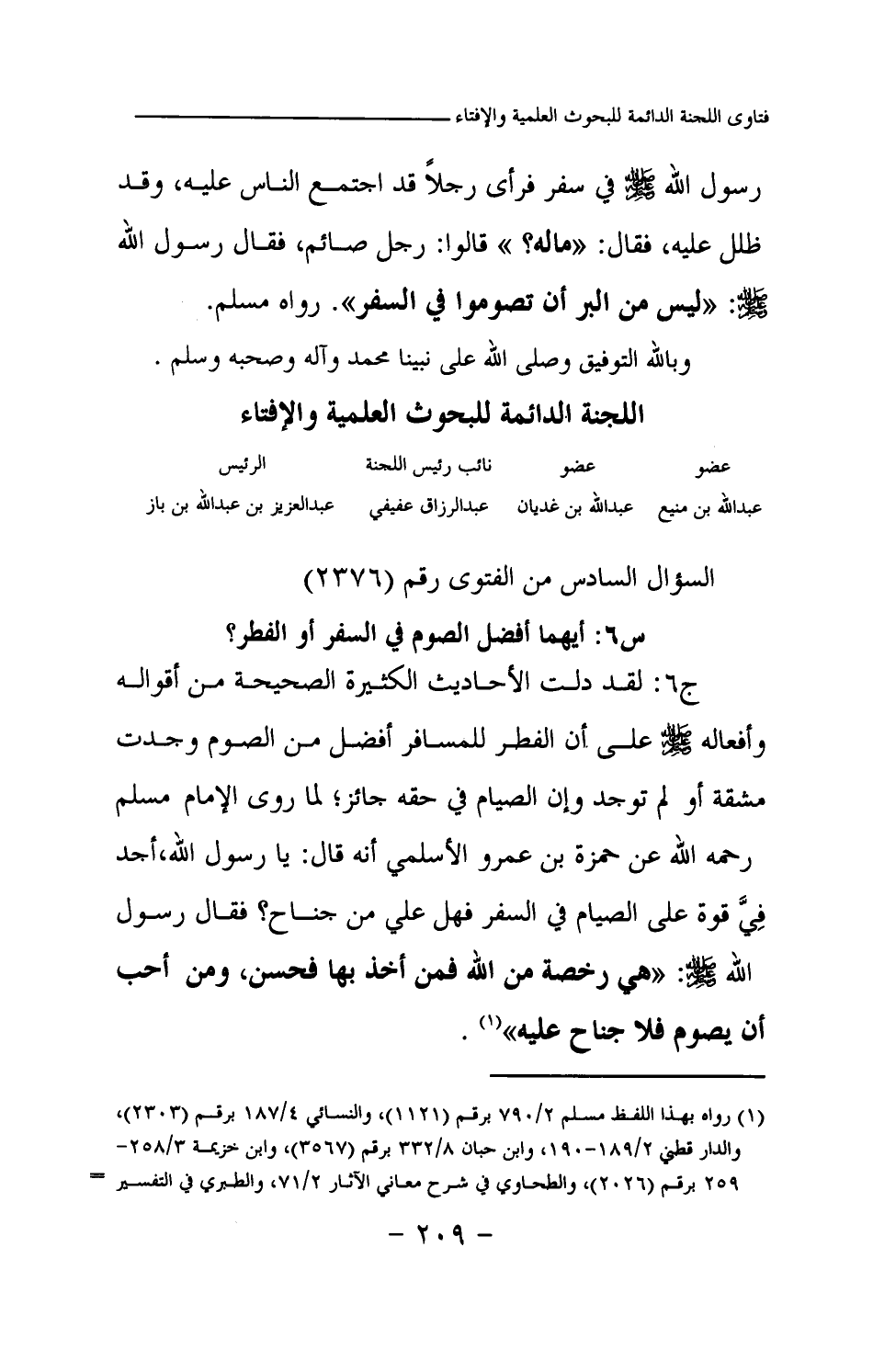 ج6: لقد دلت الأحاديث الكثيرة الصحيحة من أقواله وأفعاله صلى الله عليه وسلم على أن الفطر للمسافر أفضل من الصوم وجدت مشقة أو لم توجد وإن الصيام في حقه جائز؛ لما روى الإمام مسلم رحمه الله عن حمزة بن عمرو الأسلمي أنه قال: «يا رسول الله أجد في قوة على الصيام في السفر فهل علي من جناح؟ فقال رسول الله صلى الله عليه وسلم: هي رخصة من الله فمن أخذ بها فحسن، ومن أحب أن يصوم فلا جناح عليه (¬1) »