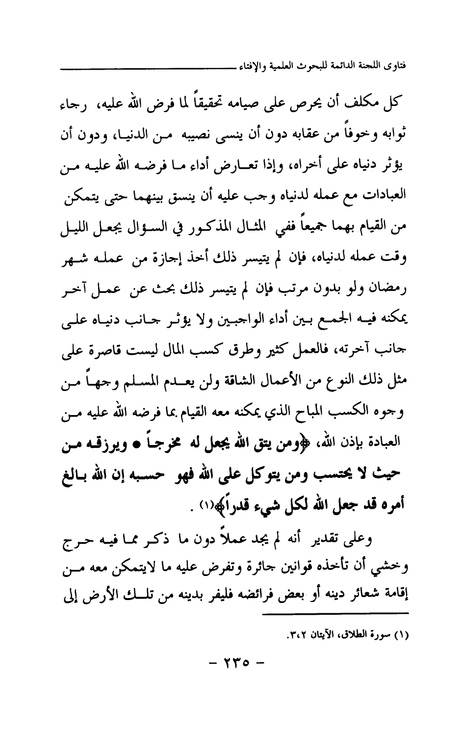 كل مكلف أن يحرص على صيامه تحقيقا لما فرض الله عليه، رجاء ثوابه وخوفا من عقابه دون أن ينسى نصيبه من الدنيا، ودون أن يؤثر دنياه على أخراه، وإذا تعارض أداء ما فرضه الله عليه من العبادات مع عمله لدنياه وجب عليه أن ينسق بينهما حتى يتمكن من القيام بهما جميعا ففي المثال المذكور في السؤال يجعل الليل وقت عمله لدنياه، فإن لم يتيسر ذلك أخذ إجازة من عمله شهر رمضان ولو بدون مرتب فإن لم يتيسر ذلك بحث عن عمل آخر يمكنه فيه الجمع بين أداء الواجبين ولا يؤثر جانب دنياه على جانب آخرته، فالعمل كثير وطرق كسب المال ليست قاصرة على مثل ذلك النوع من الأعمال الشاقة ولن يعدم المسلم وجها من وجوه الكسب المباح الذي يمكنه معه القيام بما فرضه الله عليه من العبادة بإذن الله، {وَمَنْ يَتَّقِ اللَّهَ يَجْعَلْ لَهُ مَخْرَجًا} (¬1) {وَيَرْزُقْهُ مِنْ حَيْثُ لَا يَحْتَسِبُ وَمَنْ يَتَوَكَّلْ عَلَى اللَّهِ فَهُوَ حَسْبُهُ إِنَّ اللَّهَ بَالِغُ أَمْرِهِ قَدْ جَعَلَ اللَّهُ لِكُلِّ شَيْءٍ قَدْرًا} (¬2)