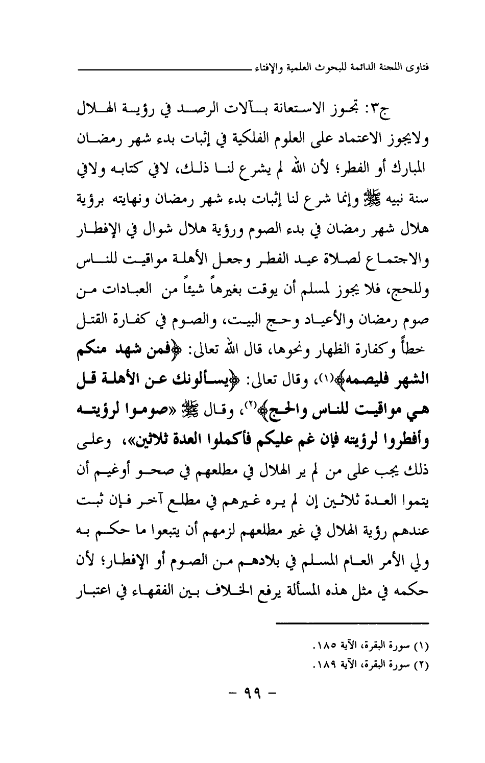 ج3: تجوز الاستعانة بآلات الرصد في رؤية الهلال ولا يجوز الاعتماد على العلوم الفلكية في إثبات بدء شهر رمضان المبارك أو الفطر؛ لأن الله لم يشرع لنا ذلك، لا في كتابه ولا في سنة نبيه صلى الله عليه وسلم وإنما شرع لنا إثبات بدء شهر رمضان ونهايته برؤية هلال شهر رمضان في بدء الصوم ورؤية هلال شوال في الإفطار والاجتماع لصلاة عيد الفطر وجعل الأهلة مواقيت للناس وللحج، فلا يجوز لمسلم أن يوقت بغيرها شيئا من العبادات من صوم رمضان والأعياد وحج البيت، والصوم في كفارة القتل خطأ وكفارة الظهار ونحوها، قال الله تعالى: {فَمَنْ شَهِدَ مِنْكُمُ الشَّهْرَ فَلْيَصُمْهُ} (¬1) وقال تعالى: {يَسْأَلُونَكَ عَنِ الْأَهِلَّةِ قُلْ هِيَ مَوَاقِيتُ لِلنَّاسِ وَالْحَجِّ} (¬2) وقال صلى الله عليه وسلم «صوموا لرؤيته وأفطروا لرؤيته فإن غم عليكم فأكملوا العدة ثلاثين (¬3) » وعلى ذلك يجب على من لم ير الهلال في مطلعهم في صحو أو غيم أن يتموا العدة ثلاثين إن لم يره غيرهم في مطلع آخر فإن ثبت عندهم رؤية الهلال في غير مطلعهم لزمهم أن يتبعوا ما حكم به ولي الأمر العام المسلم في بلادهم من الصوم أو الإفطار؛ لأن حكمه في مثل هذه المسألة يرفع الخلاف بين الفقهاء في اعتبار