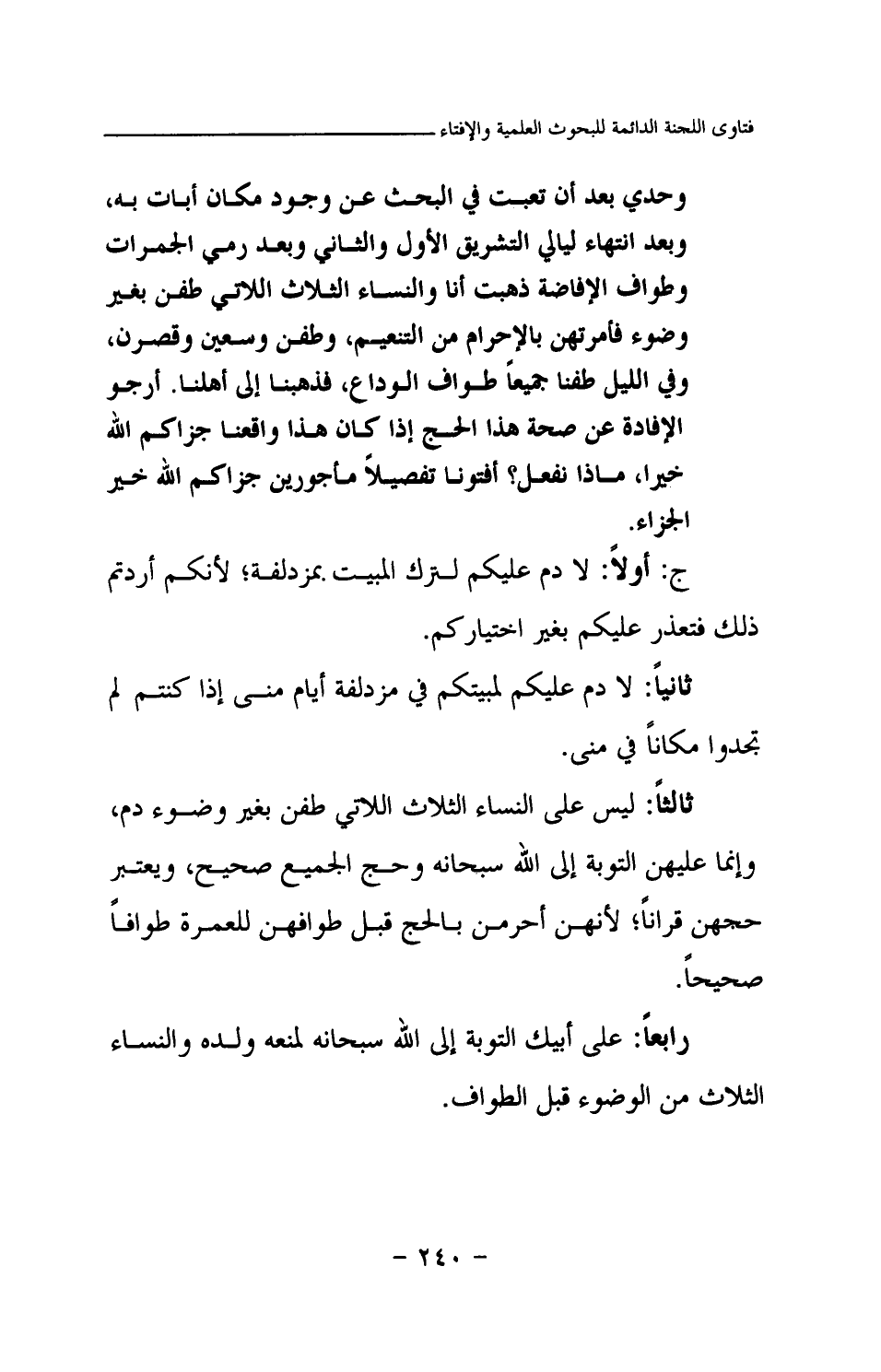 ثالثا: ليس على النساء الثلاث اللاتي طفن بغير وضوء دم، وإنما عليهن التوبة إلى الله سبحانه وحج الجميع صحيح، ويعتبر حجهن قرانا؛ لأنهن أحرمن بالحج قبل طوافهن للعمرة طوافا صحيحا.