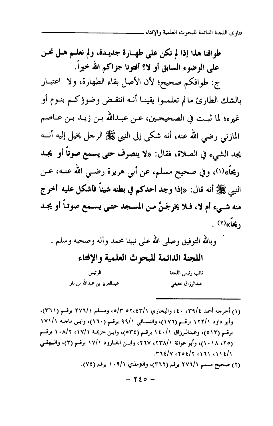 ج: طوافكم صحيح؛ لأن الأصل بقاء الطهارة، ولا اعتبار بالشك الطارئ ما لم تعلموا يقينا أنه انتقض وضوؤكم بنوم أو غيره؛ لما ثبت في الصحيحين، عن عبد الله بن زيد بن عاصم المازني رضي الله عنه، أنه شكى إلى النبي صلى الله عليه وسلم الرجل يخيل إليه أنه يجد الشيء في الصلاة، فقال: «لا ينصرف حتى يسمع صوتا أو يجد ريحا (¬1) » ، وفي صحيح مسلم، عن أبي هريرة رضي الله عنه، عن النبي صلى الله عليه وسلم أنه قال: «إذا وجد أحدكم في بطنه شيئا فأشكل عليه أخرج منه شيء أم لا، فلا يخرجن من المسجد حتى يسمع صوتا أو يجد ريحا (¬2) » .