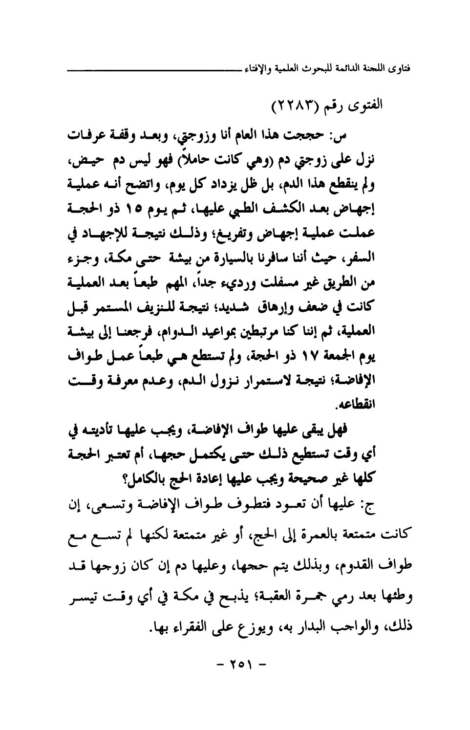 س: حججت هذا العام أنا وزوجتي، وبعد وقفة عرفات نزل على زوجتي دم (وهي كانت حاملا) فهو ليس دم حيض، ولم ينقطع هذا الدم، بل ظل يزداد كل يوم، واتضح أنه عملية إجهاض بعد الكشف الطبي عليها، ثم يوم 15 ذو الحجة عملت عملية إجهاض وتفريغ؛ وذلك نتيجة للإجهاد في السفر، حيث إننا سافرنا بالسيارة من بيشة حتى مكة، وجزء من الطريق غير مسفلت ورديء جدا، المهم طبعا بعد العملية كانت في ضعف وإرهاق شديد؛ نتيجة للنزيف المستمر قبل العملية، ثم إننا كنا مرتبطين بمواعيد الدوام، فرجعنا إلى بيشة يوم الجمعة 17 ذو الحجة، ولم تستطع هي طبعا عمل طواف الإفاضة؛ نتيجة لاستمرار نزول الدم، وعدم معرفة وقت انقطاعه.
