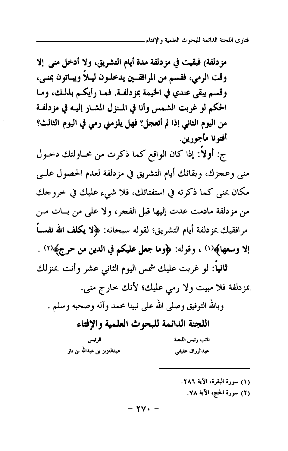 ج: أولا: إذا كان الواقع كما ذكرت من محاولتك دخول منى وعجزك، وبقائك أيام التشريق في مزدلفة لعدم الحصول على مكان بمنى كما ذكرته في استفتائك، فلا شيء عليك في خروجك من مزدلفة ما دمت عدت إليها قبل الفجر، ولا على من بات من مرافقيك بمزدلفة أيام التشريق؛ لقوله سبحانه: {لَا يُكَلِّفُ اللَّهُ نَفْسًا إِلَّا وُسْعَهَا} (¬1) وقوله: {وَمَا جَعَلَ عَلَيْكُمْ فِي الدِّينِ مِنْ حَرَجٍ} (¬2)