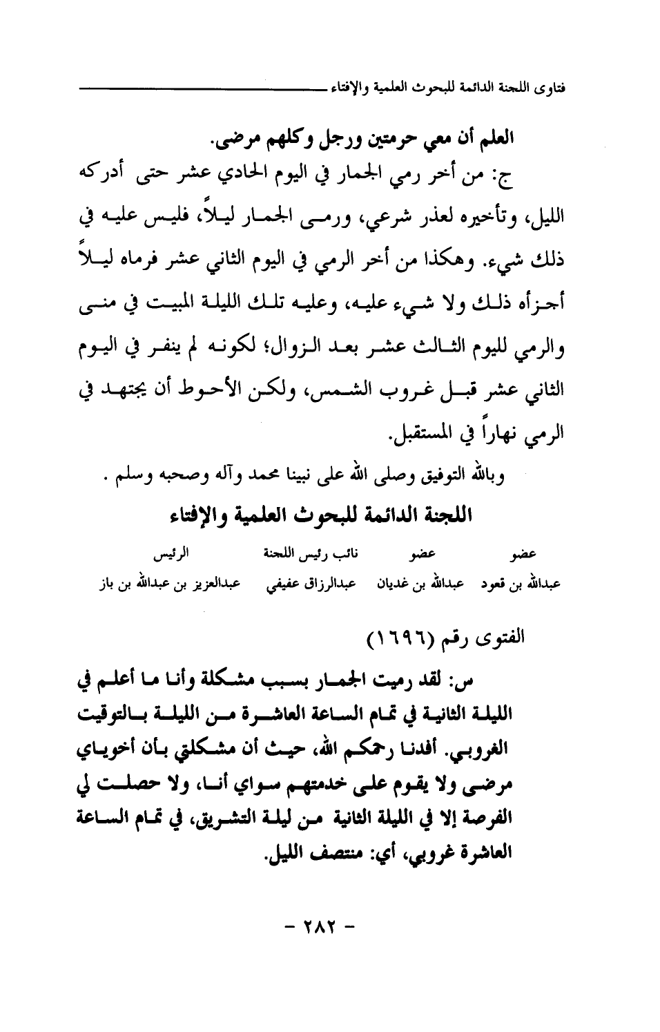 ج: من أخر رمي الجمار في اليوم الحادي عشر حتى أدركه الليل، وتأخيره لعذر شرعي، ورمى الجمار ليلا، فليس عليه في ذلك شيء. وهكذا من أخر الرمي في اليوم الثاني عشر فرماه ليلا أجزأه ذلك ولا شيء عليه، وعليه تلك الليلة المبيت في منى والرمي لليوم الثالث عشر بعد الزوال؛ لكونه لم ينفر في اليوم الثاني عشر قبل غروب الشمس، ولكن الأحوط أن يجتهد في الرمي نهارا في المستقبل.