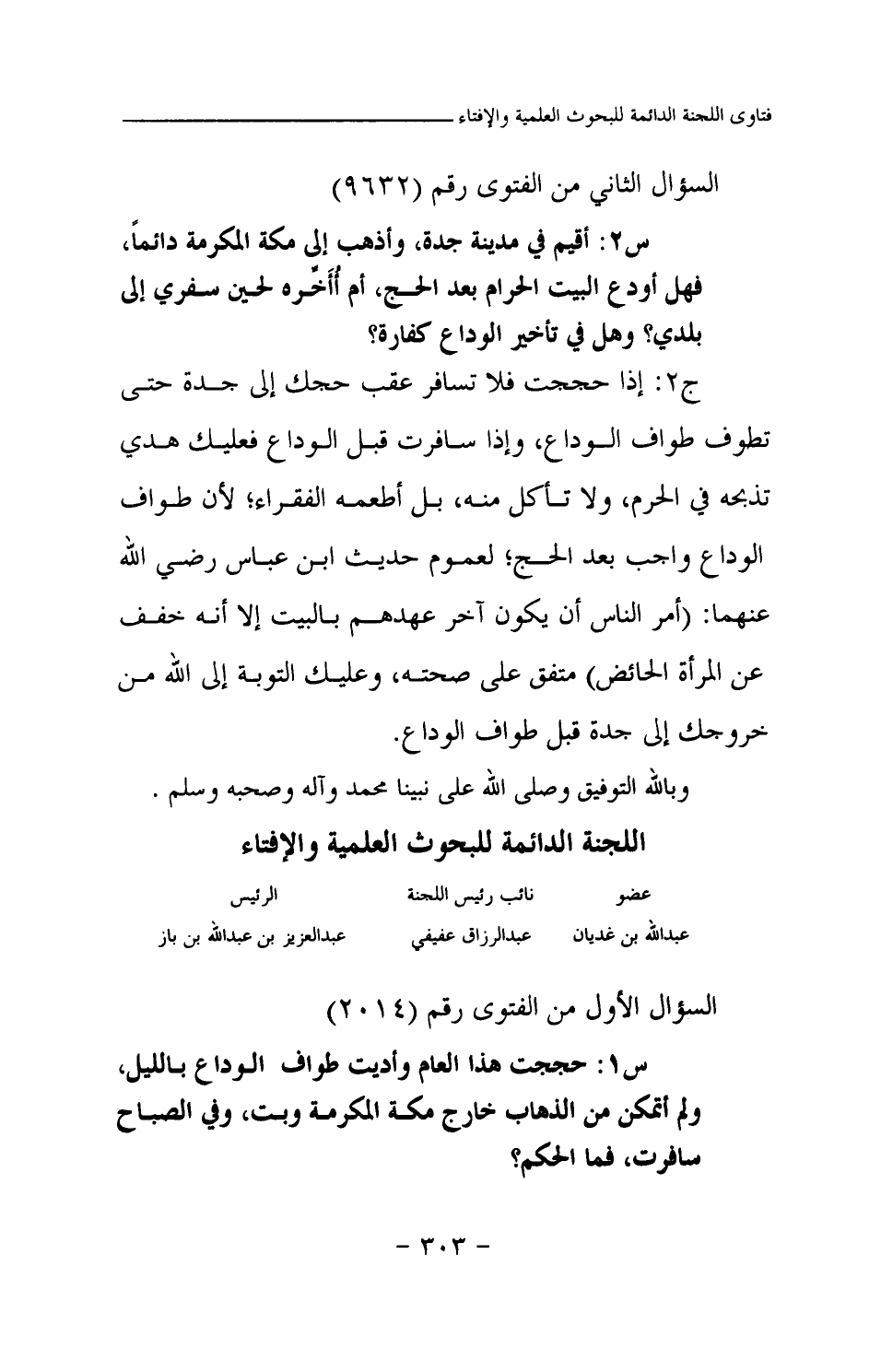 ج2: إذا حججت فلا تسافر عقب حجك إلى جدة حتى تطوف طواف الوداع، وإذا سافرت قبل الوداع فعليك هدي تذبحه في الحرم، ولا تأكل منه، بل أطعمه الفقراء؛ لأن طواف الوداع واجب بعد الحج؛ لعموم حديث ابن عباس رضي الله عنهما: «أمر الناس أن يكون آخر عهدهم بالبيت إلا أنه خفف عن المرأة الحائض (¬1) » متفق على صحته وعليك التوبة إلى الله من خروجك إلى جدة قبل طواف الوداع.