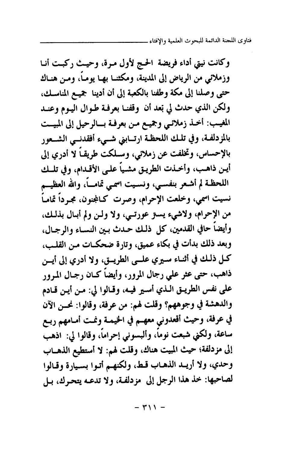 وكانت نيتي أداء فريضة الحج لأول مرة، وحيث ركبت أنا وزملائي من الرياض إلى المدينة، ومكثنا بها يوما، ومن هناك حتى وصلنا إلى مكة وطفنا بالكعبة إلى أن أدينا جميع المناسك، ولكن الذي حدث لي بعد أن وقفنا بعرفة طوال اليوم وعند المغيب: أخذ زملائي وجميع من بعرفة بالرحيل إلى المبيت بالمزدلفة، وفي تلك اللحظة ارتابني شيء أفقدني الشعور بالإحساس، وتخلفت عن زملائي، وسلكت طريقا لا أدري إلى أين ذاهب، وأخذت الطريق مشيا على الأقدام، وفي تلك اللحظة لم أشعر بنفسي، ونسيت اسمي تماما، والله العظيم نسيت اسمي، وخلعت الإحرام، وصرت كالمجنون، مجردا تماما من الإحرام، ولا شيء يستر عورتي، ولا ولن ولم أبال بذلك، وأيضا حافي القدمين، كل ذلك حدث بين النساء والرجال، وبعد ذلك بدأت في بكاء عميق، وتارة ضحكات من القلب، كل ذلك في أثناء سيري على الطريق، ولا أدري إلى أين ذاهب، حتى عثر علي رجال المرور، وأيضا كان رجال المرور على نفس الطريق الذي أسير فيه، وقالوا لي: من أين قادم والدهشة في وجوههم؟ وقلت لهم: من عرفة، وقالوا: نحن الآن في عرفة، وحيث أقعدوني معهم في الخيمة ونمت أمامهم ربع ساعة، ولكني شبعت نوما، وألبسوني إحراما، وقالوا لي: اذهب إلى مزدلفة؛ حيث المبيت هناك، وقلت لهم: لا أستطيع الذهاب وحدي، ولا أريد الذهاب قط، ولكنهم أتوا بسيارة وقالوا لصاحبها: خذ هذا الرجل إلى مزدلفة، ولا تدعه يتحرك، بل