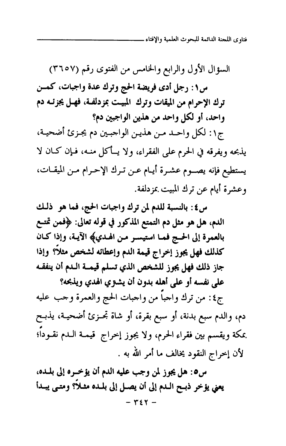 س4: بالنسبة للدم لمن ترك واجبات الحج، فما هو ذلك الدم، هل هو مثل دم التمتع المذكور في قوله تعالى: {فَمَنْ تَمَتَّعَ بِالْعُمْرَةِ إِلَى الْحَجِّ فَمَا اسْتَيْسَرَ مِنَ الْهَدْيِ} (¬1) الآية، وإذا كان كذلك فهل يجوز إخراج قيمة الدم وإعطائه لشخص مثلا؟ وإذا جاز ذلك فهل يجوز للشخص الذي تسلم قيمة الدم أن ينفقه على نفسه أو على أهله بدون أن يشتري الهدي ويذبحه؟