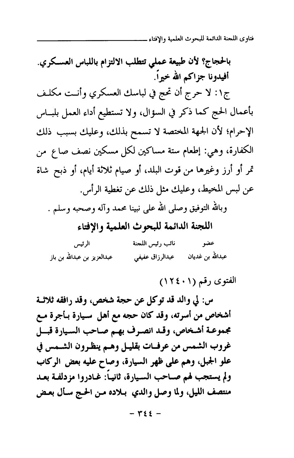 ج1: لا حرج أن تحج في لباسك العسكري وأنت مكلف بأعمال الحج كما ذكر في السؤال، ولا تستطيع أداء العمل بلباس الإحرام؛ لأن الجهة المختصة لا تسمح بذلك، وعليك بسبب ذلك الكفارة، وهي: إطعام ستة مساكين لكل مسكين نصف صاع من تمر أو أرز وغيرها من قوت البلد، أو صيام ثلاثة أيام، أو ذبح شاة عن لبس المخيط، وعليك مثل ذلك عن تغطية الرأس.