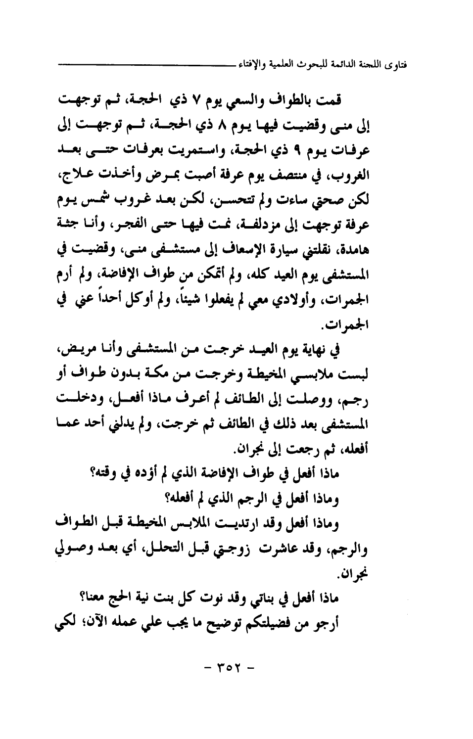 قمت بالطواف والسعي يوم 7 ذي الحجة، ثم توجهت إلى منى وقضيت فيها يوم 8 ذي الحجة، ثم توجهت إلى عرفات يوم 9 ذي الحجة، واستمريت بعرفات حتى بعد الغروب، في منتصف يوم عرفة أصبت بمرض وأخذت علاج، لكن صحتي ساءت ولم تتحسن، لكن بعد غروب شمس يوم عرفة توجهت إلى مزدلفة، نمت فيها حتى الفجر، وأنا جثة هامدة، نقلتني سيارة الإسعاف إلى مستشفى منى، وقضيت في المستشفى يوم العيد كله، ولم أتمكن من طواف الإفاضة، ولم أرم الجمرات، وأولادي معي لم يفعلوا شيئا، ولم أوكل أحدا عني في الجمرات.