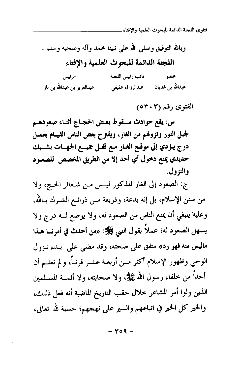 ج: الصعود إلى الغار المذكور ليس من شعائر الحج، ولا من سنن الإسلام، بل إنه بدعة، وذريعة من ذرائع الشرك بالله، وعليه ينبغي أن يمنع الناس من الصعود له، ولا يوضع له درج ولا يسهل الصعود له؛ عملا بقول النبي صلى الله عليه وسلم: «من أحدث في أمرنا هذا ما ليس منه فهو رد (¬1) » متفق على صحته وقد مضى على بدء نزول الوحي وظهور الإسلام أكثر من أربعة عشر قرنا، ولم نعلم أن أحدا من خلفاء رسول الله صلى الله عليه وسلم، ولا صحابته، ولا أئمة المسلمين الذين ولوا أمر المشاعر خلال حقب التاريخ الماضية أنه فعل ذلك، والخير كل الخير في اتباعهم والسير على نهجهم؛ حسبة لله تعالى،