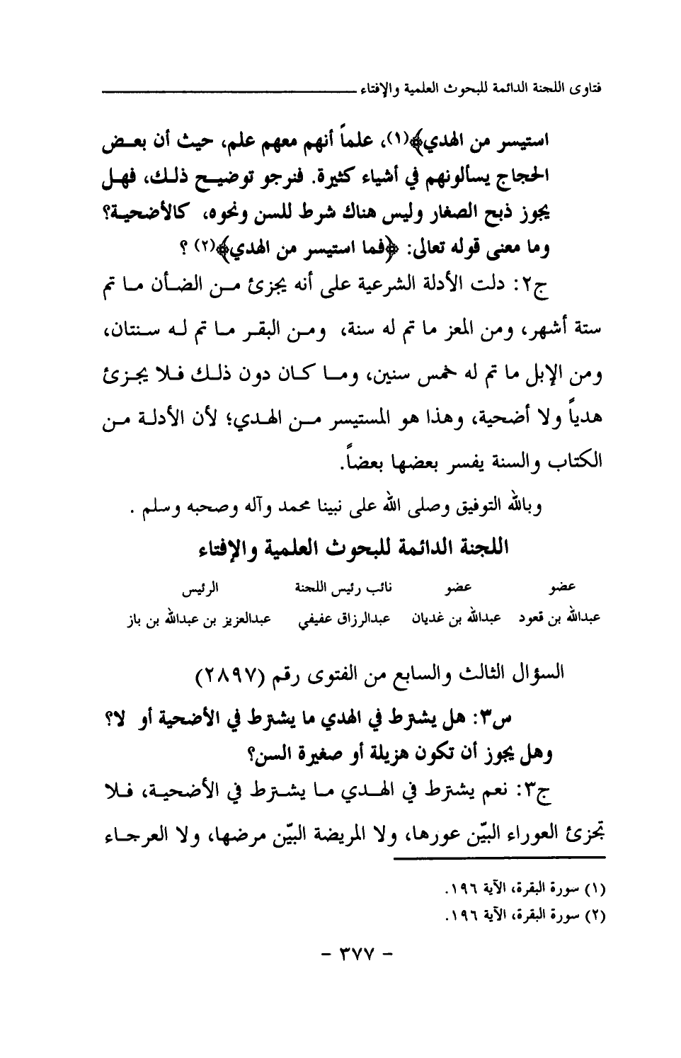 {فَمَا اسْتَيْسَرَ مِنَ الْهَدْيِ} (¬1) علما أنهم معهم علم، حيث إن بعض الحجاج يسألونهم في أشياء كثيرة. فنرجو توضيح ذلك، فهل يجوز ذبح الصغار وليس هناك شرط للسن ونحوه، كالأضحية؟ وما معنى قوله تعالى: {فَمَا اسْتَيْسَرَ مِنَ الْهَدْيِ} (¬2) ؟