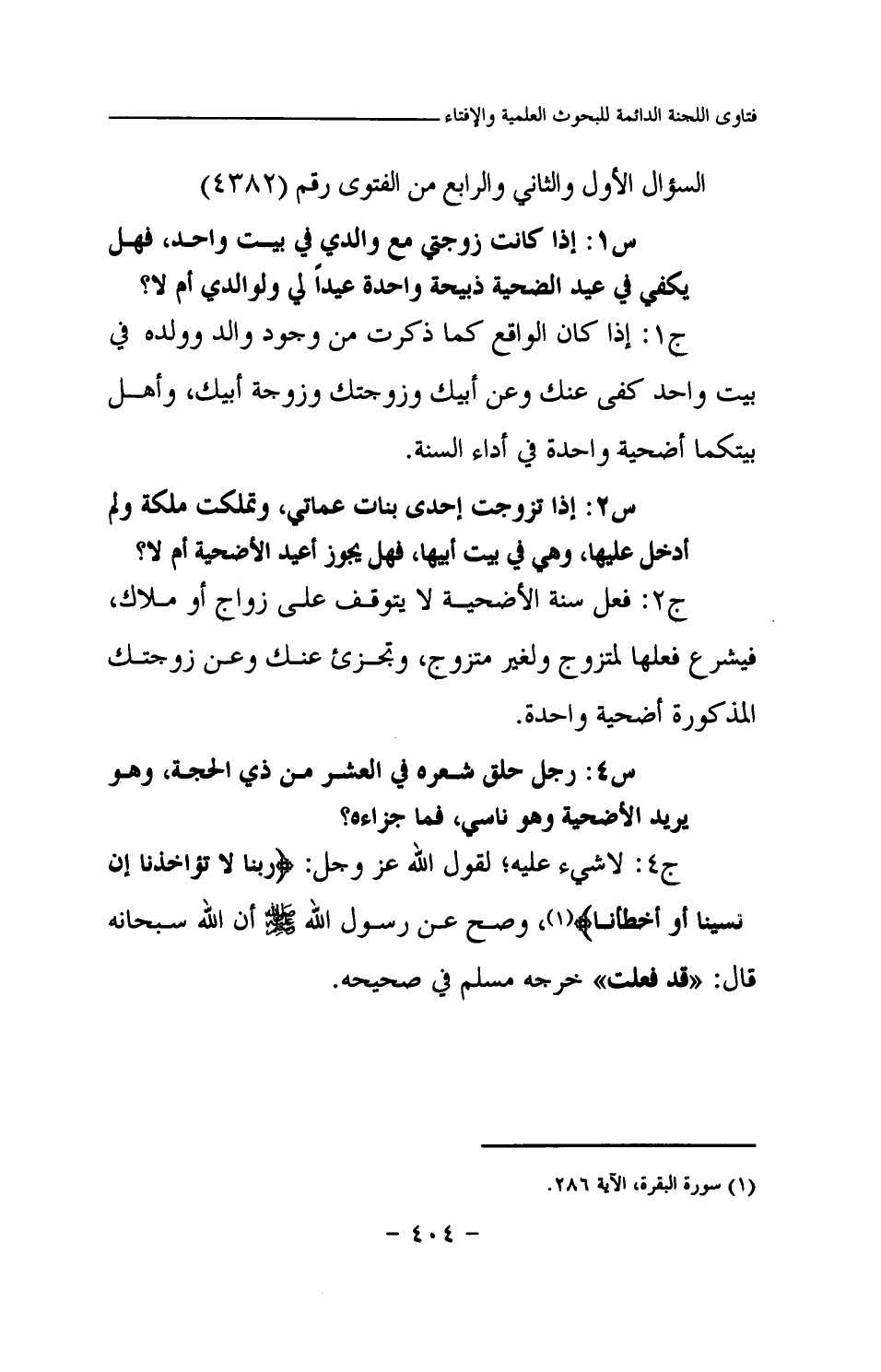 س2: إذا تزوجت إحدى بنات عماتي، وتملكت ملكة ولم أدخل عليها، وهي في بيت أبيها، فهل يجوز أعيد الأضحية أم لا؟