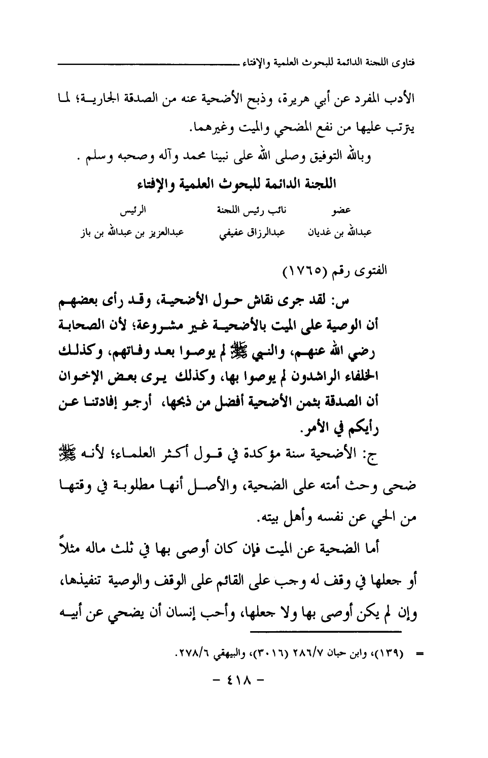 الأدب المفرد عن أبي هريرة، وذبح الأضحية عنه من الصدقة الجارية؛ لما يترتب عليها من نفع المضحي والميت وغيرهما.