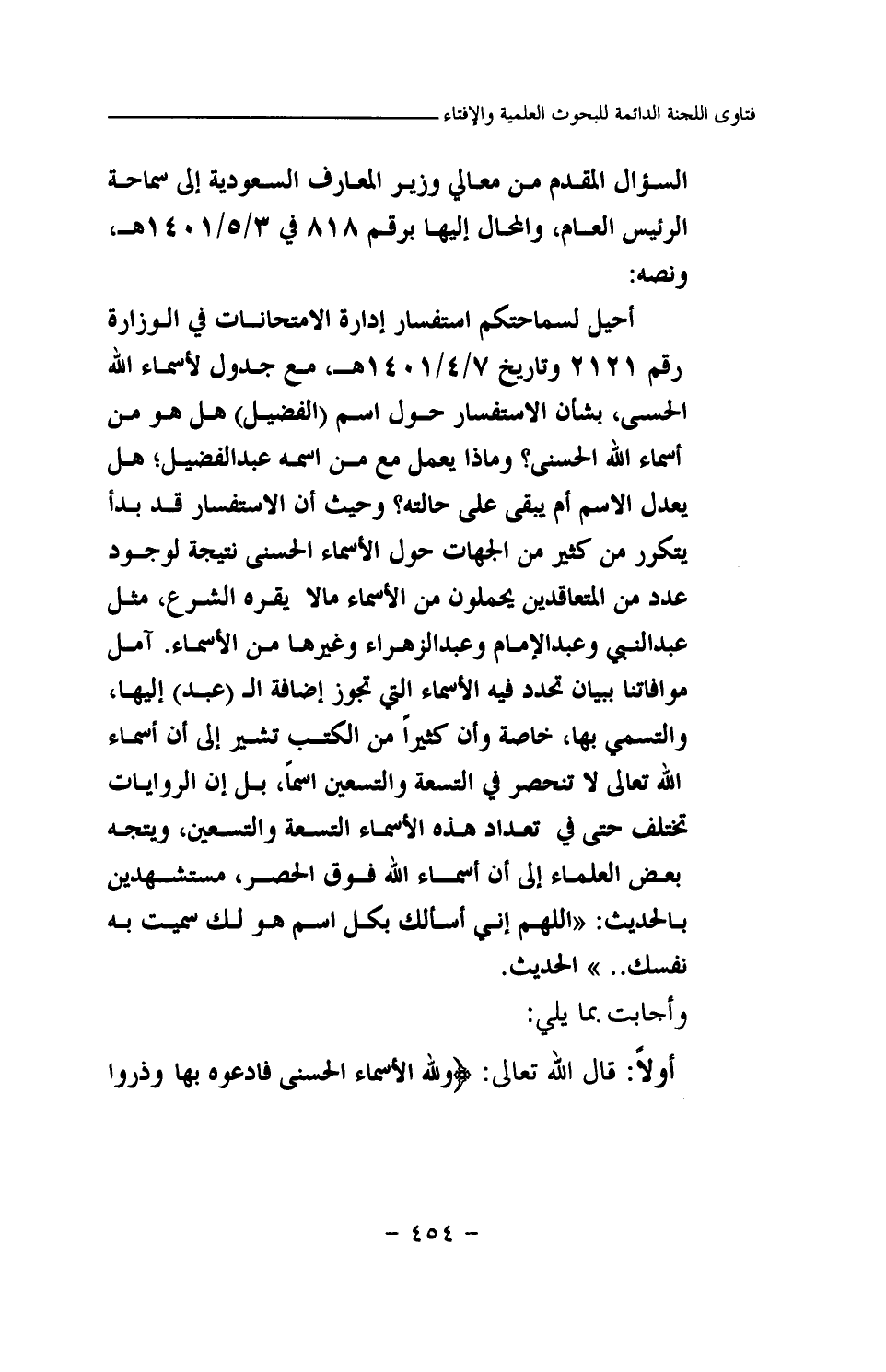 أحيل لسماحتكم استفسار إدارة الامتحانات في الوزارة رقم 2121 وتاريخ 7 \ 4 \ 1401هـ، مع جدول لأسماء الله الحسنى، بشأن الاستفسار حول اسم (الفضيل) هل هو من أسماء الله الحسنى؟ وماذا يعمل مع من اسمه عبد الفضيل؛ هل يعدل الاسم أم يبقى على حالته؟ وحيث إن الاستفسار قد بدأ يتكرر من كثير من الجهات حول الأسماء الحسنى نتيجة لوجود عدد من المتعاقدين يحملون من الأسماء ما لا يقره الشرع، مثل عبد النبي وعبد الإمام وعبد الزهراء وغيرها من الأسماء. آمل موافاتنا ببيان تحدد فيه الأسماء التي تجوز إضافة الـ (عبد) إليها، والتسمي بها، خاصة وأن كثيرا من الكتب تشير إلى أن أسماء الله تعالى لا تنحصر في التسعة والتسعين اسما، بل إن الروايات تختلف حتى في تعداد هذه الأسماء التسعة والتسعين، ويتجه بعض العلماء إلى أن أسماء الله فوق الحصر، مستشهدين بالحديث: «اللهم إني أسألك بكل اسم هو لك سميت به نفسك (¬1) » . . . الحديث.