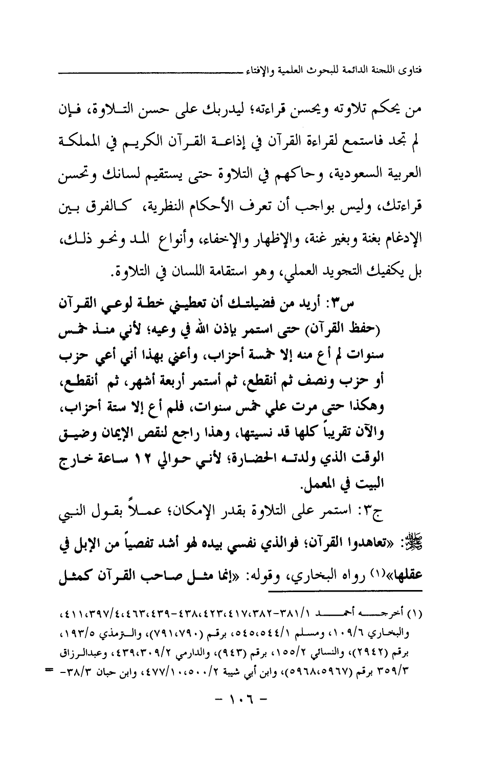 ج3: استمر على التلاوة بقدر الإمكان؛ عملا بقول النبي صلى الله عليه وسلم: «تعاهدوا القرآن؛ فوالذي نفسي بيده لهو أشد تفصيا من الإبل في عقلها (¬1) » رواه البخاري وقوله: