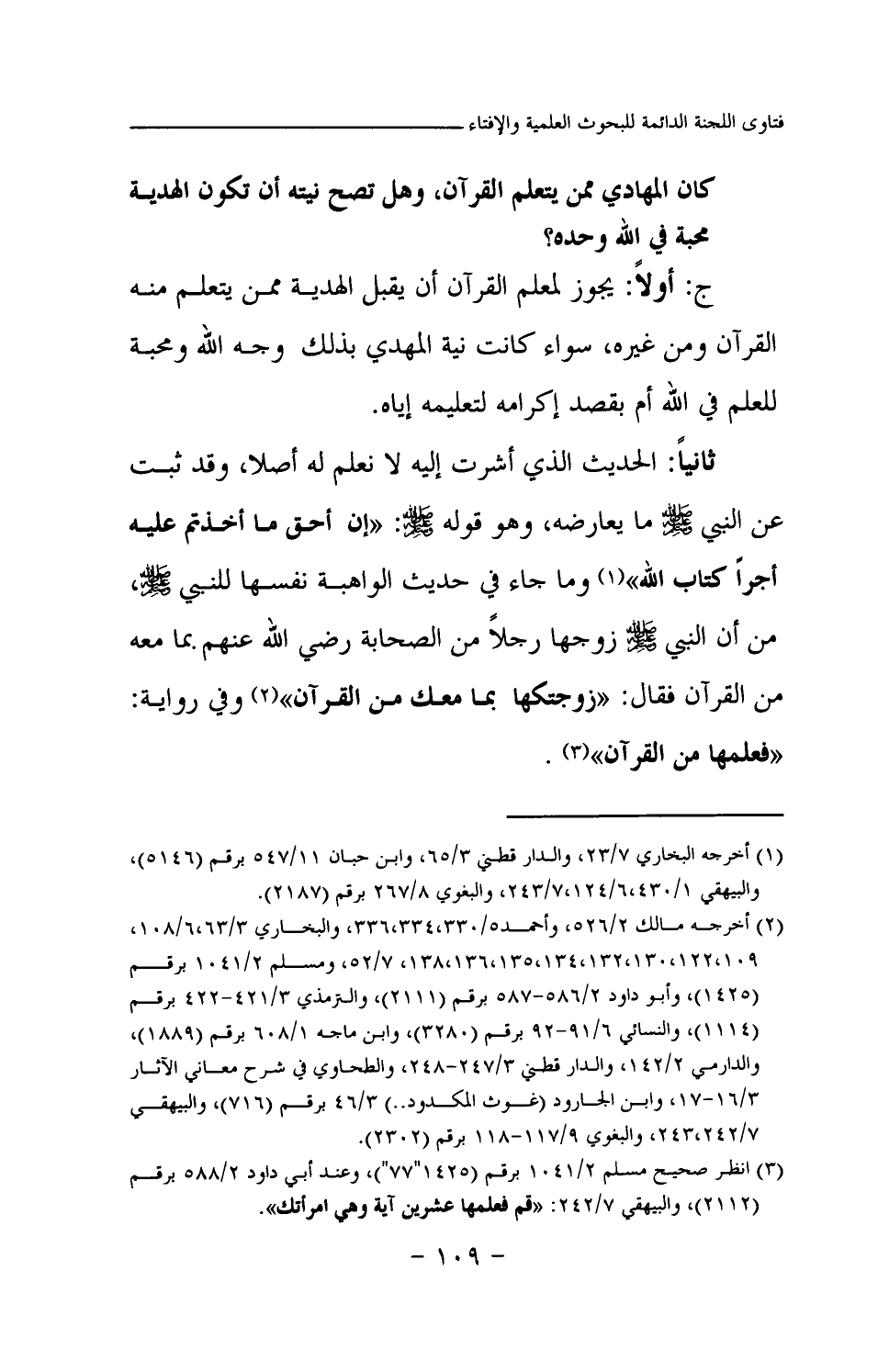 ج: أولا: يجوز لمعلم القرآن أن يقبل الهدية ممن يتعلم منه القرآن ومن غيره، سواء كانت نية المهدي بذلك وجه الله ومحبة للعلم في الله أم بقصد إكرامه لتعليمه إياه. ثانيا: الحديث الذي أشرت إليه لا نعلم له أصلا، وقد ثبت عن النبي صلى الله عليه وسلم ما يعارضه، وهو قوله صلى الله عليه وسلم: «إن أحق ما أخذتم عليه أجرا كتاب الله (¬1) » وما جاء في حديث الواهبة نفسها للنبي صلى الله عليه وسلم، من أن النبي صلى الله عليه وسلم زوجها رجلا من الصحابة رضي الله عنهم بما معه من القرآن فقال: «زوجتكها بما معك من القرآن (¬2) » وفي رواية: «فعلمها من القرآن (¬3) » .