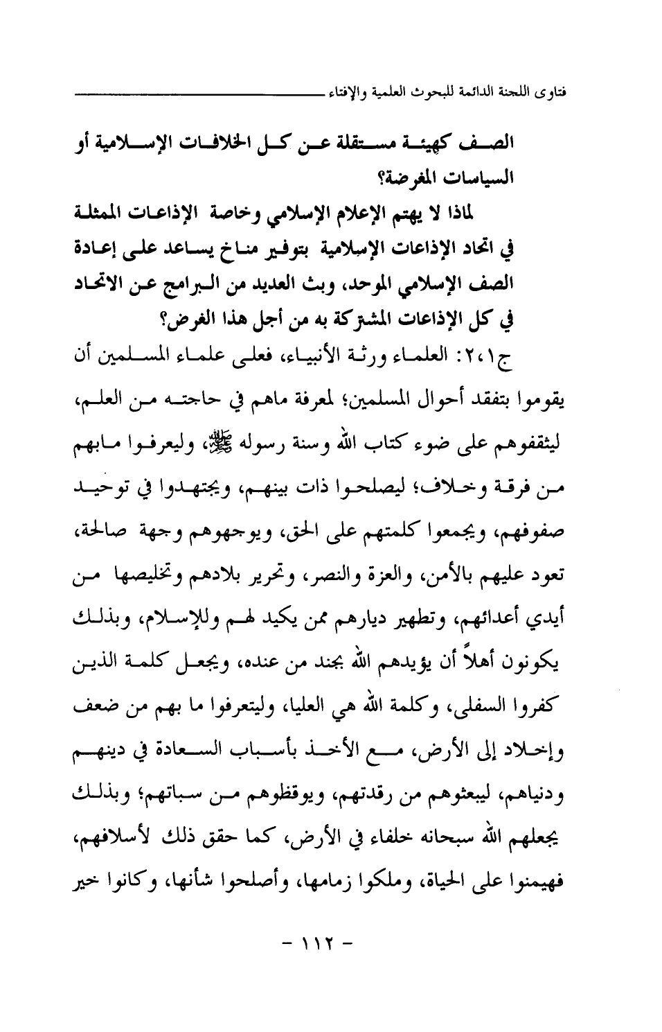 ج1، 2: العلماء ورثة الأنبياء، فعلى علماء المسلمين أن يقوموا بتفقد أحوال المسلمين؛ لمعرفة ما هم في حاجته من العلم، ليثقفوهم على ضوء كتاب الله وسنة رسوله صلى الله عليه وسلم، وليعرفوا ما بهم من فرقة وخلاف؛ ليصلحوا ذات بينهم، ويجتهدوا في توحيد صفوفهم، ويجمعوا كلمتهم على الحق، ويوجهوهم وجهة صالحة، تعود عليهم بالأمن، والعزة والنصر، وتحرير بلادهم وتخليصها من أيدي أعدائهم، وتطهير ديارهم ممن يكيد لهم وللإسلام، وبذلك يكونون أهلا أن يؤيدهم الله بجند من عنده، ويجعل كلمة الذين كفروا السفلى، وكلمة الله هي العليا، وليتعرفوا ما بهم من ضعف وإخلاد إلى الأرض، مع الأخذ بأسباب السعادة في دينهم ودنياهم، ليبعثوهم من رقدتهم، ويوقظوهم من سباتهم؛ وبذلك يجعلهم الله سبحانه خلفاء في الأرض، كما حقق ذلك لأسلافهم، فهيمنوا على الحياة، وملكوا زمامها، وأصلحوا شأنها، وكانوا خير