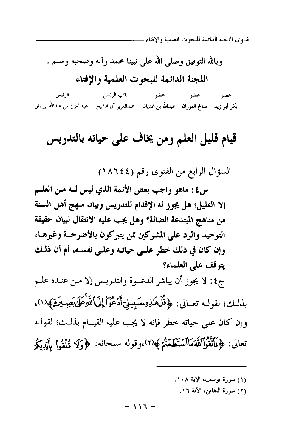 ج4: لا يجوز أن يباشر الدعوة والتدريس إلا من عنده علم بذلك؛ لقوله تعالى: {قُلْ هَذِهِ سَبِيلِي أَدْعُو إِلَى اللَّهِ عَلَى بَصِيرَةٍ} (¬1) وإن كان على حياته خطر فإنه لا يجب عليه القيام بذلك؛ لقوله تعالى: {فَاتَّقُوا اللَّهَ مَا اسْتَطَعْتُمْ} (¬2) وقوله سبحانه: {وَلَا تُلْقُوا بِأَيْدِيكُمْ إِلَى التَّهْلُكَةِ} (¬3)