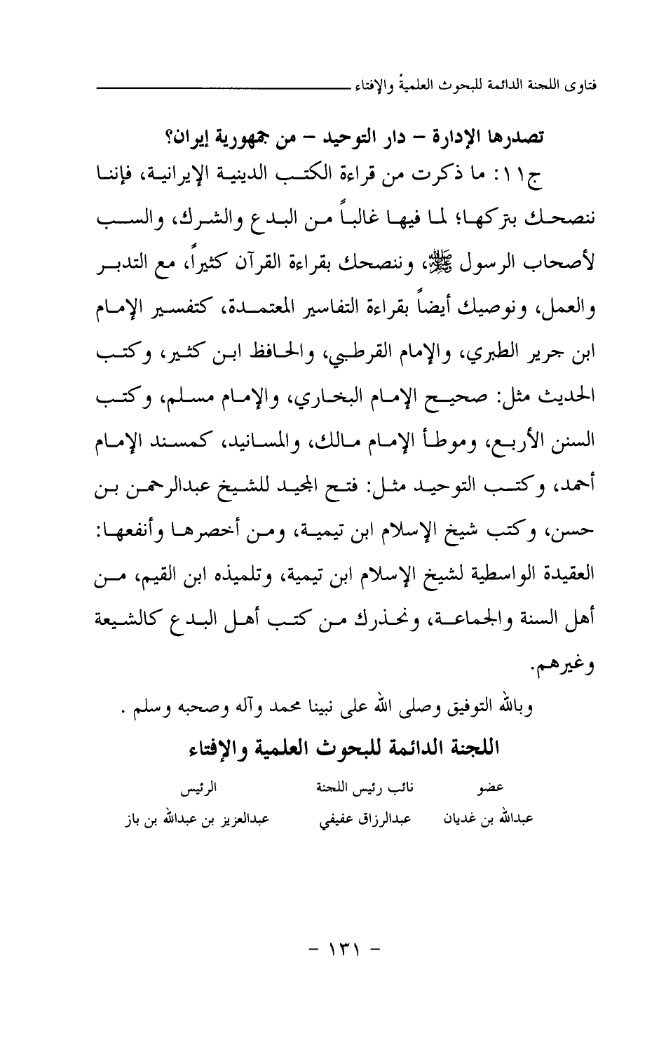 ج 11: ما ذكرت من قراءة الكتب الدينية الإيرانية، فإننا ننصحك بتركها؛ لما فيها غالبا من البدع والشرك، والسب لأصحاب الرسول صلى الله عليه وسلم، وننصحك بقراءة القرآن كثيرا، مع التدبر والعمل، ونوصيك أيضا بقراءة التفاسير المعتمدة، كتفسير الإمام ابن جرير الطبري، والإمام القرطبي، والحافظ ابن كثير، وكتب الحديث مثل: صحيح الإمام البخاري، والإمام مسلم، وكتب السنن الأربع، وموطأ الإمام مالك، والمسانيد، كمسند الإمام أحمد، وكتب التوحيد مثل: فتح المجيد للشيخ عبد الرحمن بن حسن، وكتب شيخ الإسلام ابن تيمية، ومن أخصرها وأنفعها: العقيدة الواسطية لشيخ الإسلام ابن تيمية، وتلميذه ابن القيم، من أهل السنة والجماعة، ونحذرك من كتب أهل البدع كالشيعة وغيرهم.