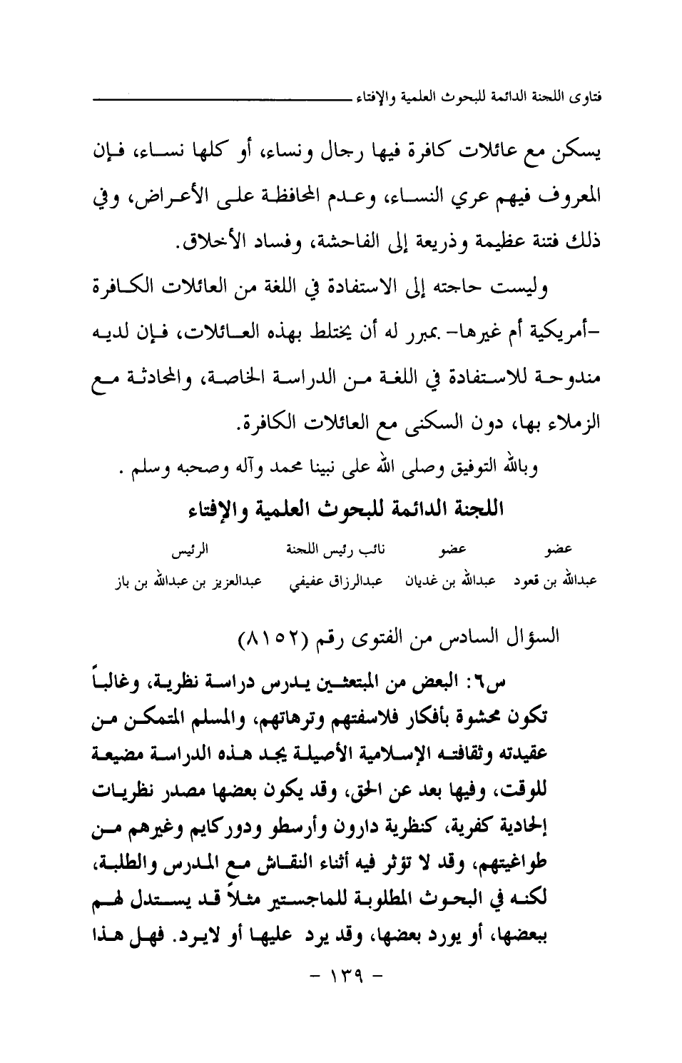 وليست حاجته إلى الاستفادة في اللغة من العائلات الكافرة - أمريكية أم غيرها- بمبرر له أن يختلط بهذه العائلات، فإن لديه مندوحة للاستفادة في اللغة من الدراسة الخاصة، والمحادثة مع الزملاء بها، دون السكنى مع العائلات الكافرة.