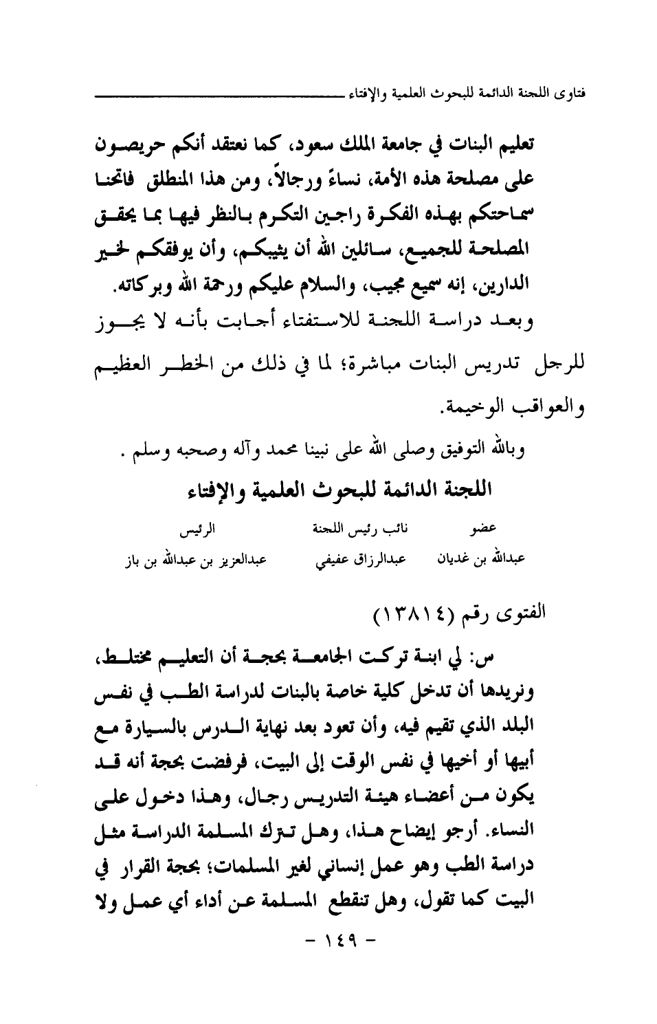 تعليم البنات في جامعة الملك سعود، كما نعتقد أنكم حريصون على مصلحة هذه الأمة، نساء ورجالا، ومن هذا المنطلق فاتحنا سماحتكم بهذه الفكرة راجين التكرم بالنظر فيها بما يحقق المصلحة للجميع، سائلين الله أن يثيبكم، وأن يوفقكم لخير الدارين، إنه سميع مجيب، والسلام عليكم ورحمة الله وبركاته.