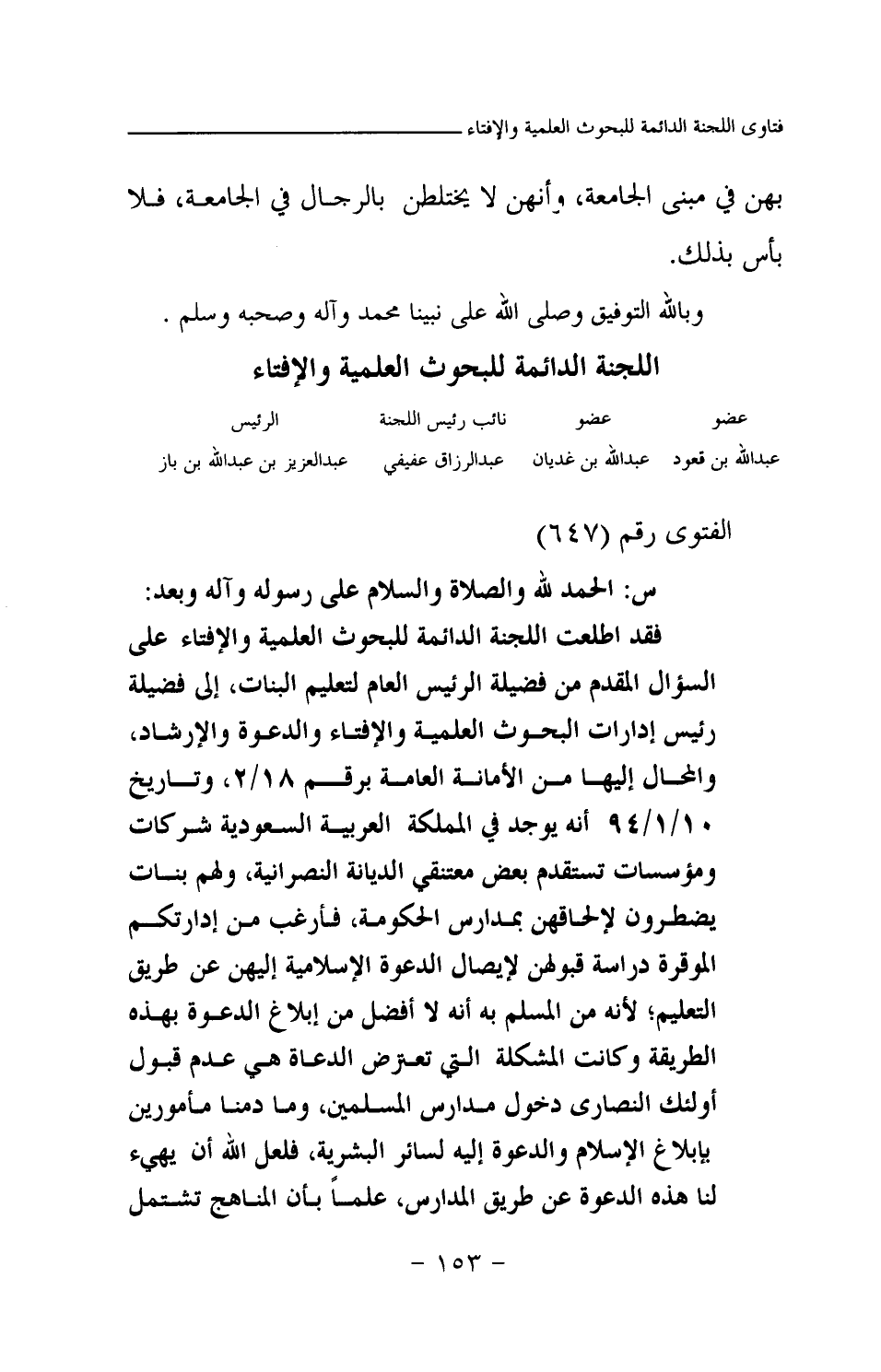 فقد اطلعت اللجنة الدائمة للبحوث العلمية والإفتاء على السؤال المقدم من فضيلة الرئيس العام لتعليم البنات، إلى فضيلة رئيس إدارات البحوث العلمية والإفتاء والدعوة والإرشاد، والمحال إليها من الأمانة العامة برقم 18 \ 2، وتاريخ 10 \ 1 \ 94 أنه يوجد في المملكة العربية السعودية شركات ومؤسسات تستقدم بعض معتنقي الديانة النصرانية، ولهم بنات يضطرون لإلحاقهن بمدارس الحكومة، فأرغب من إدارتكم الموقرة دراسة قبولهن لإيصال الدعوة الإسلامية إليهن عن طريق التعليم؛ لأنه من المسلم به أنه لا أفضل من إبلاغ الدعوة بهذه الطريقة وكانت المشكلة التي تعترض الدعاة هي عدم قبول أولئك النصارى دخول مدارس المسلمين، وما دمنا مأمورين بإبلاغ الإسلام والدعوة إليه لسائر البشرية، فلعل الله أن يهيئ لنا هذه الدعوة عن طريق المدارس، علما بأن المناهج تشتمل