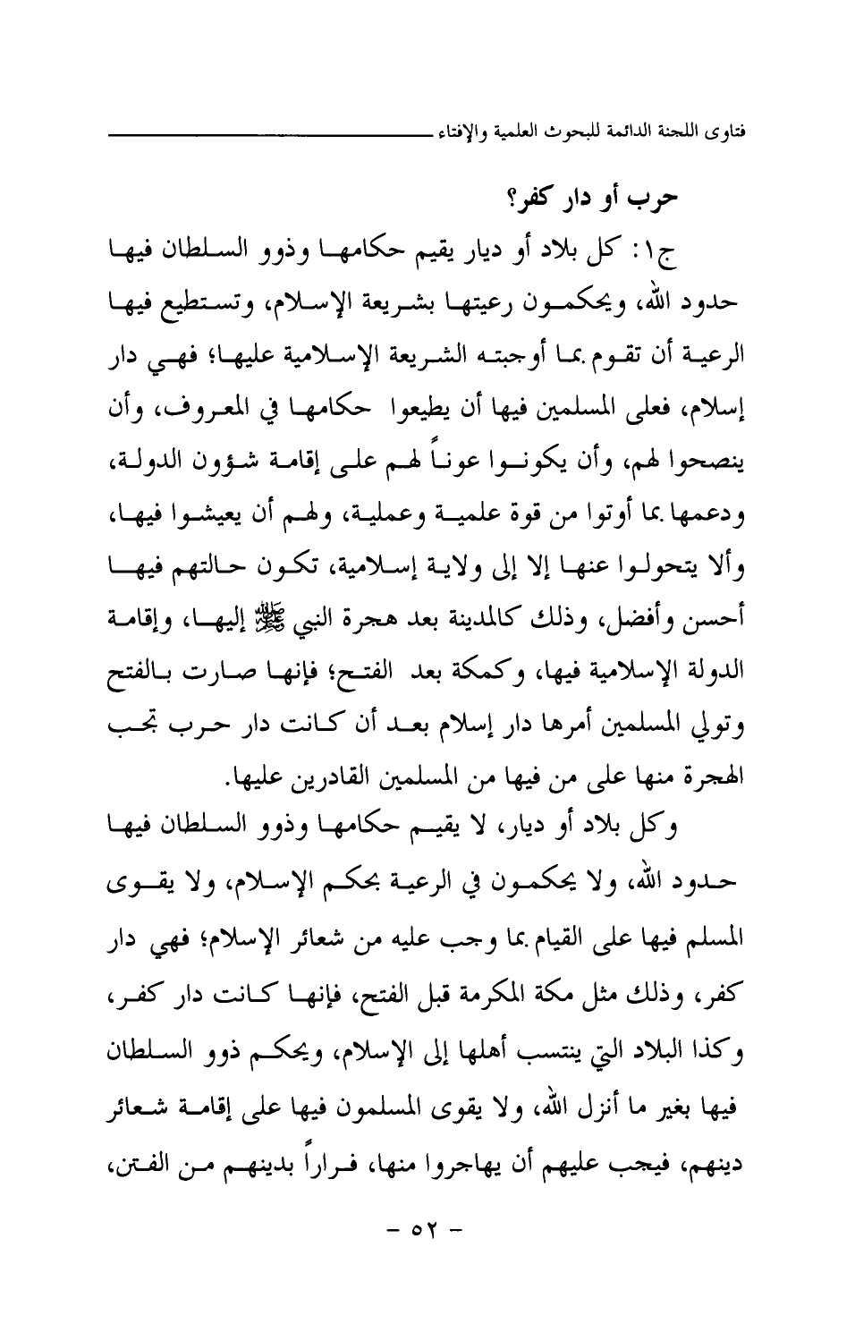 وكل بلاد أو ديار، لا يقيم حكامها وذوو السلطان فيها حدود الله، ولا يحكمون في الرعية بحكم الإسلام، ولا يقوى المسلم فيها على القيام بما وجب عليه من شعائر الإسلام؛ فهي دار كفر، وذلك مثل مكة المكرمة قبل الفتح، فإنها كانت دار كفر، وكذا البلاد التي ينتسب أهلها إلى الإسلام، ويحكم ذوو السلطان فيها بغير ما أنزل الله، ولا يقوى المسلمون فيها على إقامة شعائر دينهم، فيجب عليهم أن يهاجروا منها، فرارا بدينهم من الفتن،