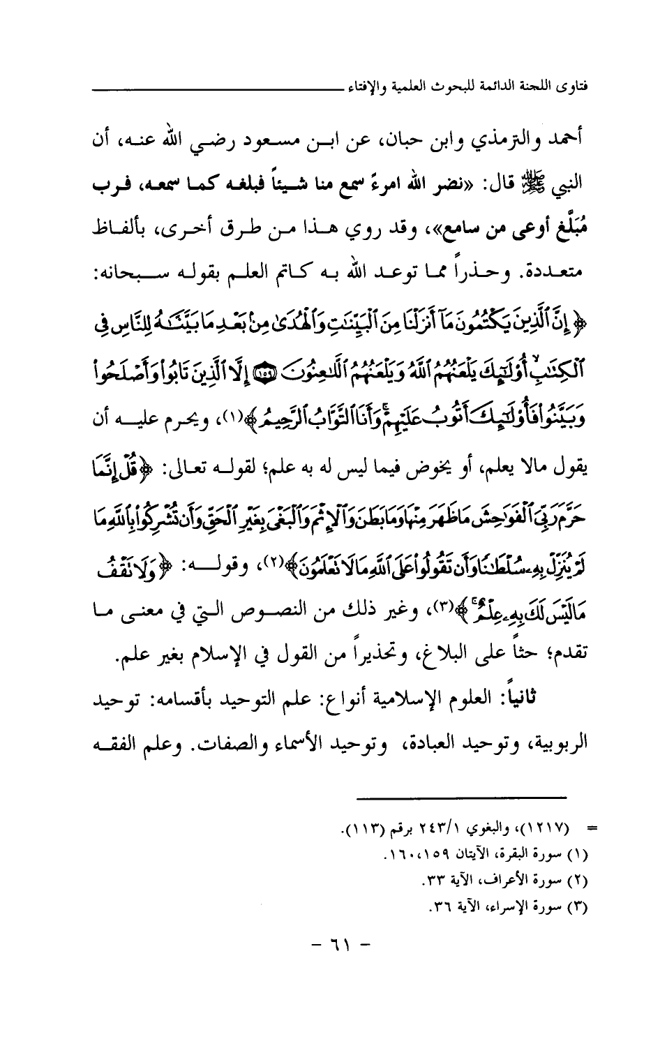 أحمد والترمذي وابن حبان، عن ابن مسعود رضي الله عنه، أن النبي صلى الله عليه وسلم قال: «نضر الله امرء سمع منا شيئا فبلغه كما سمعه، فرب مبلغ أوعى من سامع (¬1) » ، وقد روي هذا من طرق أخرى، بألفاظ متعددة. وحذرا مما توعد الله به كاتم العلم بقوله سبحانه: {إِنَّ الَّذِينَ يَكْتُمُونَ مَا أَنْزَلْنَا مِنَ الْبَيِّنَاتِ وَالْهُدَى مِنْ بَعْدِ مَا بَيَّنَّاهُ لِلنَّاسِ فِي الْكِتَابِ أُولَئِكَ يَلْعَنُهُمُ اللَّهُ وَيَلْعَنُهُمُ اللَّاعِنُونَ} (¬2) {إِلَّا الَّذِينَ تَابُوا وَأَصْلَحُوا وَبَيَّنُوا فَأُولَئِكَ أَتُوبُ عَلَيْهِمْ وَأَنَا التَّوَّابُ الرَّحِيمُ} (¬3) ويحرم عليه أن يقول ما لا يعلم، أو يخوض فيما ليس له به علم؛ لقوله تعالى: {قُلْ إِنَّمَا حَرَّمَ رَبِّيَ الْفَوَاحِشَ مَا ظَهَرَ مِنْهَا وَمَا بَطَنَ وَالْإِثْمَ وَالْبَغْيَ بِغَيْرِ الْحَقِّ وَأَنْ تُشْرِكُوا بِاللَّهِ مَا لَمْ يُنَزِّلْ بِهِ سُلْطَانًا وَأَنْ تَقُولُوا عَلَى اللَّهِ مَا لَا تَعْلَمُونَ} (¬4) وقوله: {وَلَا تَقْفُ مَا لَيْسَ لَكَ بِهِ عِلْمٌ} (¬5) وغير ذلك من النصوص التي في معنى ما تقدم؛ حثا على البلاغ، وتحذيرا من القول في الإسلام بغير علم. ثانيا: العلوم الإسلامية أنواع: علم التوحيد بأقسامه: توحيد الربوبية، وتوحيد العبادة، وتوحيد الأسماء والصفات. وعلم الفقه