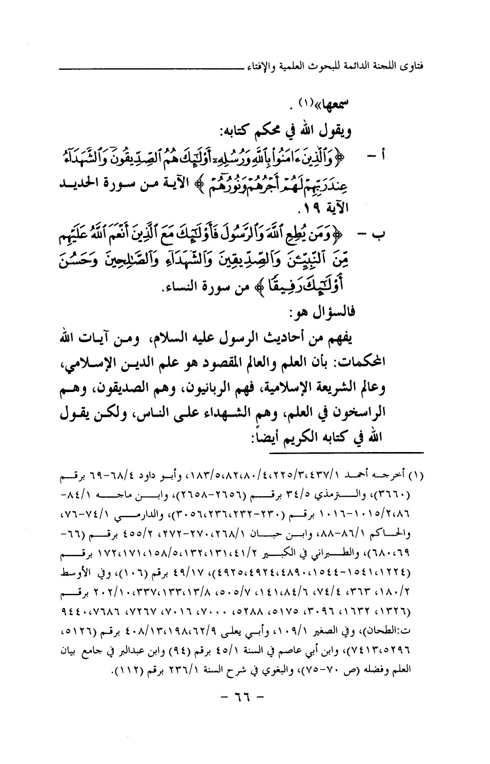 ب- {وَمَنْ يُطِعِ اللَّهَ وَالرَّسُولَ فَأُولَئِكَ مَعَ الَّذِينَ أَنْعَمَ اللَّهُ عَلَيْهِمْ مِنَ النَّبِيِّينَ وَالصِّدِّيقِينَ وَالشُّهَدَاءِ وَالصَّالِحِينَ وَحَسُنَ أُولَئِكَ رَفِيقًا} (¬2) من سورة النساء.